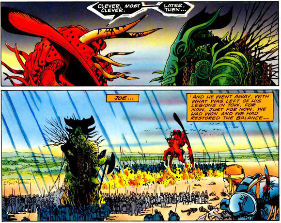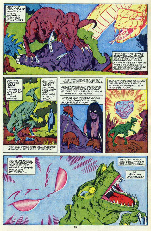 当巨大的恐龙成为地球的主宰,Set创造了自己与恐龙之间神秘的联系,从另一个维度领域,通过他们野蛮、暴力的死亡吸食释放的生命能量,因此在这数百万年间,Set积聚了庞大的力量。 盖亚Gaea女神担忧生命演化已到达尽头,再次召唤她的儿子Atum,转变成噬神者Demogorge。 Set和Demogorge(分别代表混乱和秩序)的战争,使地球陷入了长达百万年的混沌,蛇型的恶魔最终长出了七个头,并且保留这个姿态直到今天 。(Set和盖亚的战争也是恐龙与哺乳动物的战争,盖亚希望恐龙灭绝让哺乳类得以更好地进化发展,Set则是控制恐龙去屠杀当时体型娇小的哺乳类动物。)