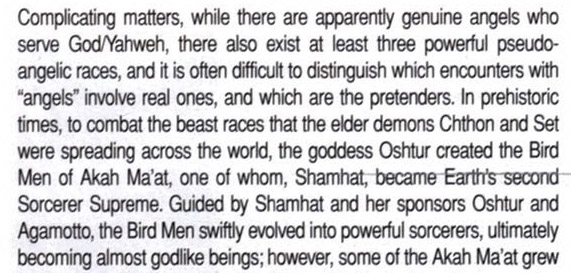 在史前时期,为了抗衡旧神Chthon和Set遍布世界各地的野兽种族,Oshtur女神创造了Akah Ma'at的鸟人,其中之一的Shamhat成为了地球第二位至尊法师。在Shamhat和她的任命者Oshtur和Agamotto的指导下,鸟人演变为强大的巫师,最终成为接近神一般的存在。