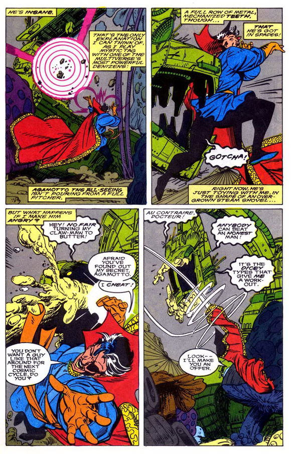 Agamotto在自己的领域内与行星吞噬者僵持,但奇异博士从一旁指出,Agamotto认为吞星不配作为他的对手,才会采取毛毛虫的形式与他战斗。