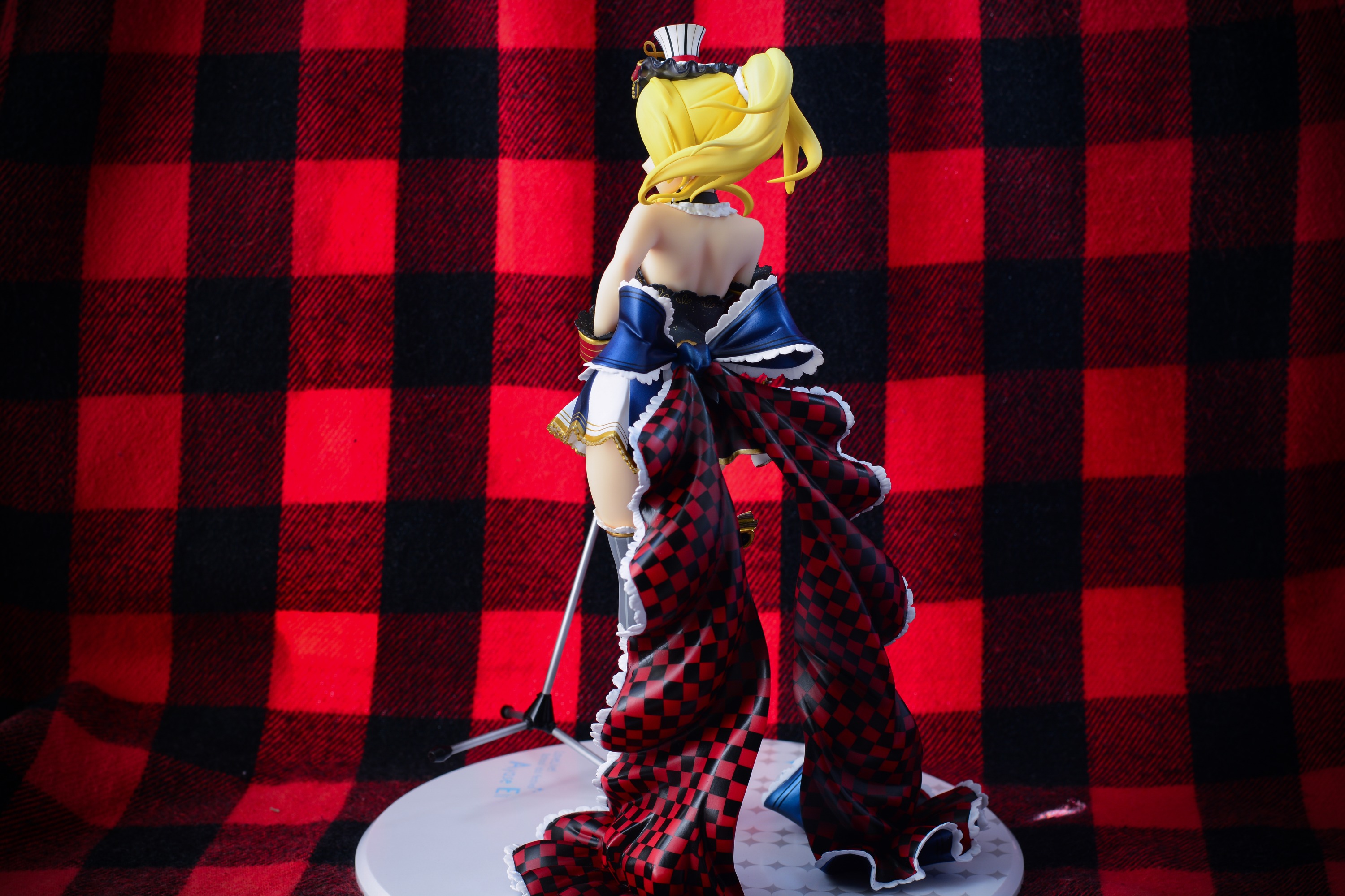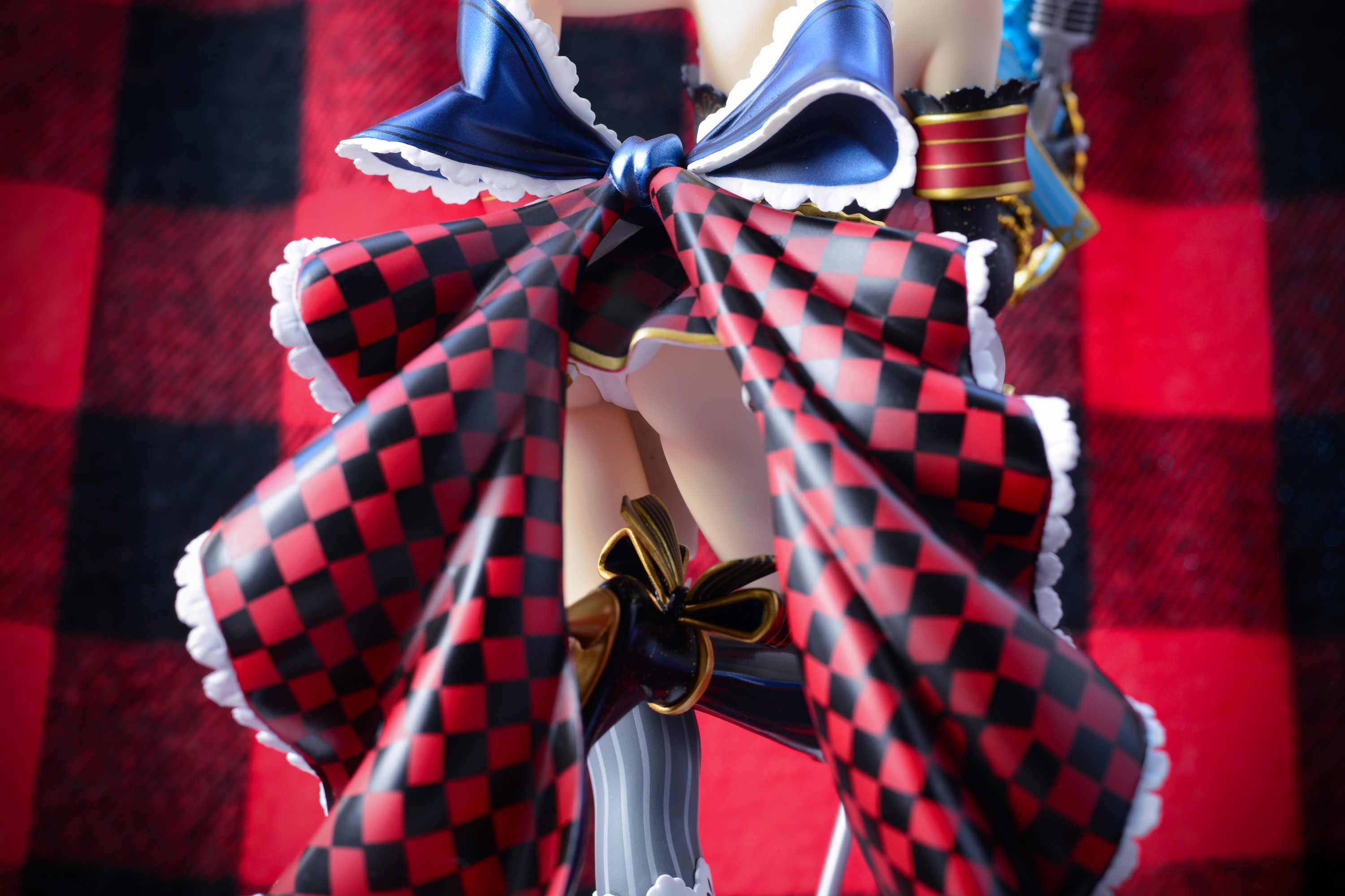 屁股若隐若现非常涩情,双腿的过膝袜也是不同的,胶质和布质的材质感都区分开来,蝴蝶结的裙摆涂装应该是印上去的吧,裙摆的蓝黑红白的配色十分华丽,最后一张图我中奖了,一块黑色没涂满
