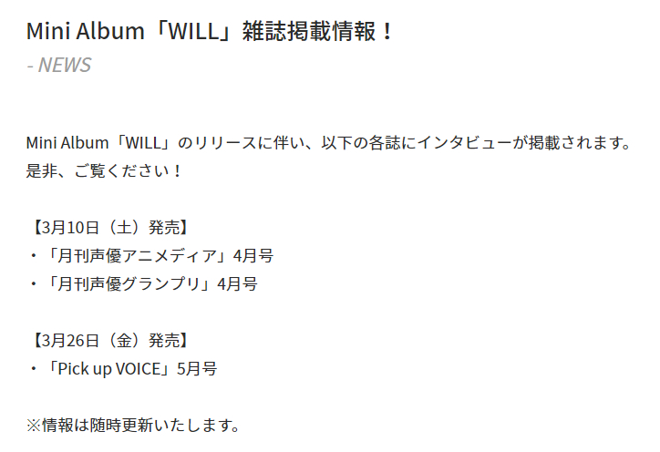 Mini Album「WILL」WEBニュース掲載情報!