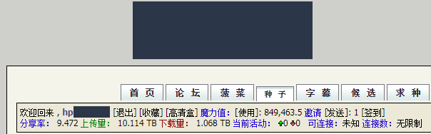 如题,求路过的大佬赏一个IPT的邀请,一定好好珍惜。主要是想用来给宝宝下载一些卡通片用的。家里有NAS,24小时开机挂种,网速是25/10的。下面放一些现有的PT站的图,放3个常用的先,别的站还有餐厅,瓷器和彩虹岛等。
