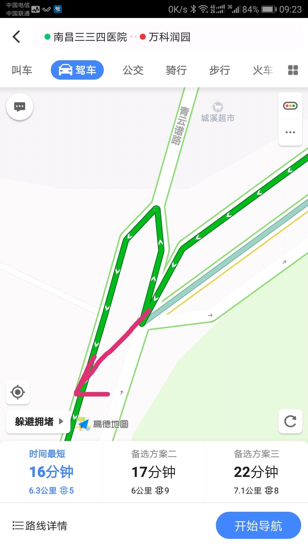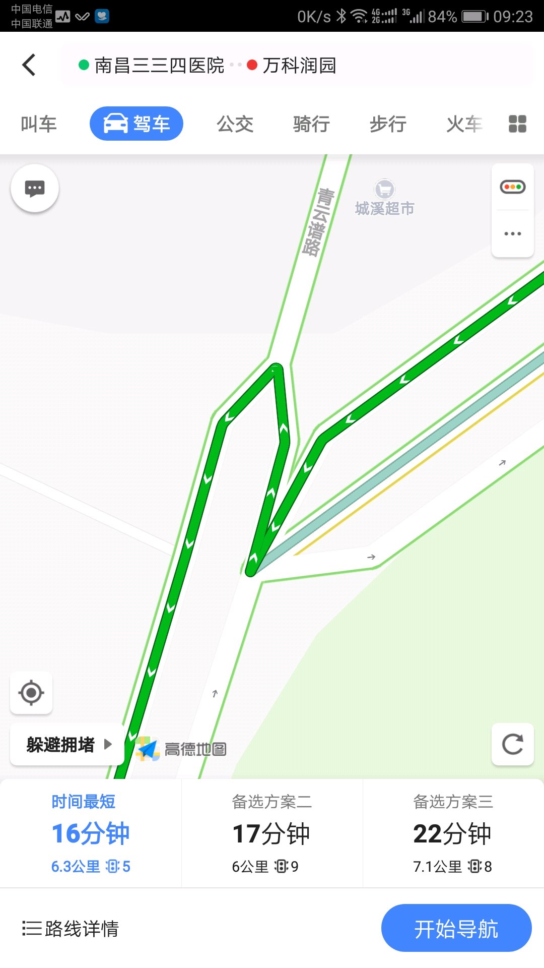 前几天上报错误居然结果是核实不了,这次放三张图,希望高德能改进,地点是南昌,洪都三三四医院到万科润园的路线