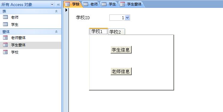建立“学生信息”和“老师信息”两个按钮,分别打开“学生窗体”和