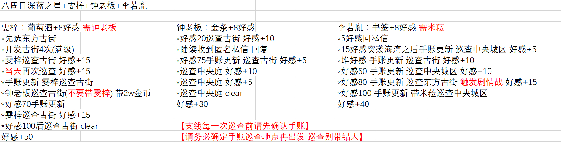 我做表格的时候是看着雯梓攻略把步骤和加的好感先打上的, 我看的也是有+5, 但我走的时候确实没看见有明确说先选古街会加那5好感就删掉了…但是+50那里忘减掉5了