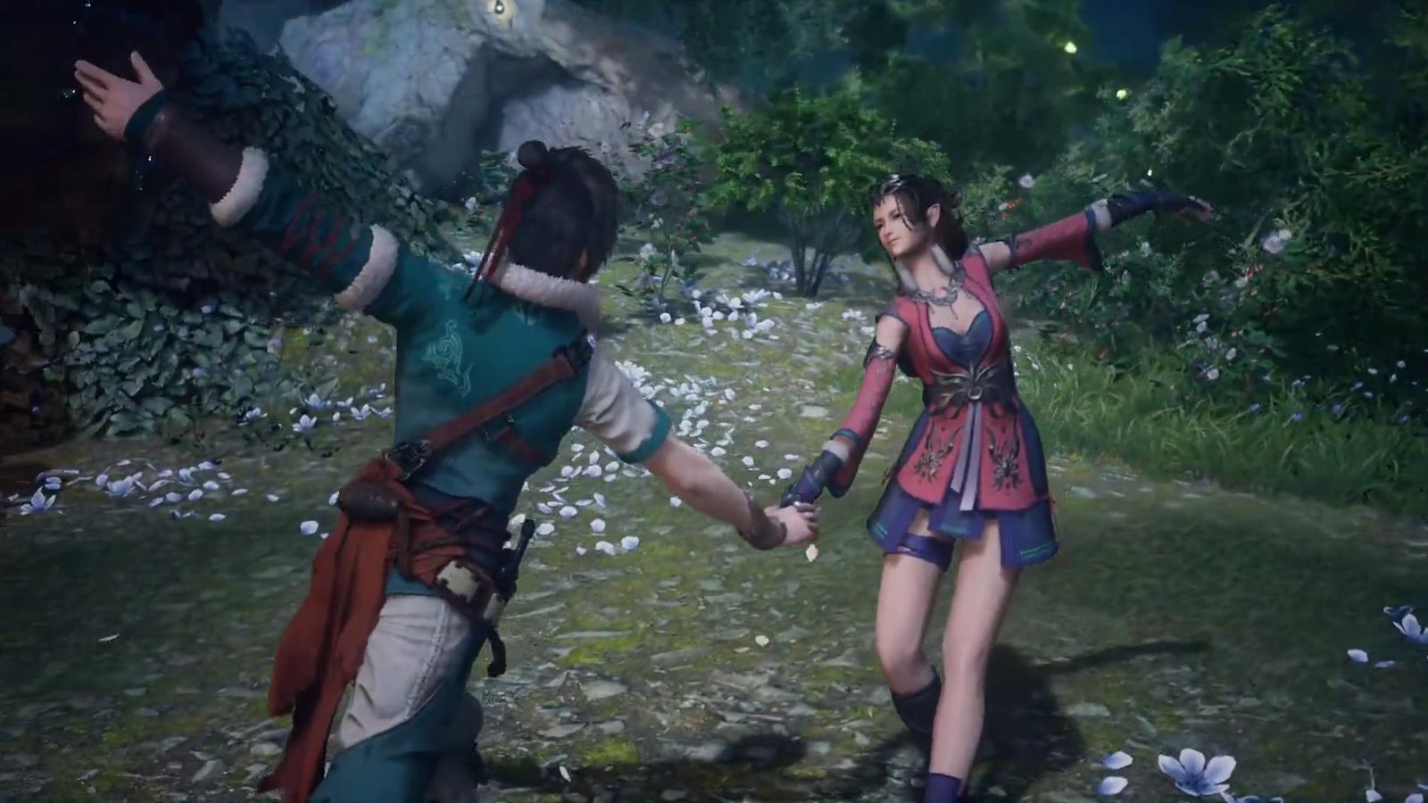 倏忽族定情舞,虽然性质和前面那个一样,但感觉比圆月之舞自然(可能是跳舞的人的原因)。主线剧情从此彻底迷了,但这舞是真不错,哎。为了弥补圆月之舞的遗憾,望舒表示要教飞星跳舞。随着bgm从简单温馨变得明快,飞星从生疏地学习到熟练配合到两人一气呵成完成舞蹈,最后音乐和舞蹈结束,牵手告白。单看这一流程完成的很好气氛渲染到位没啥问题。