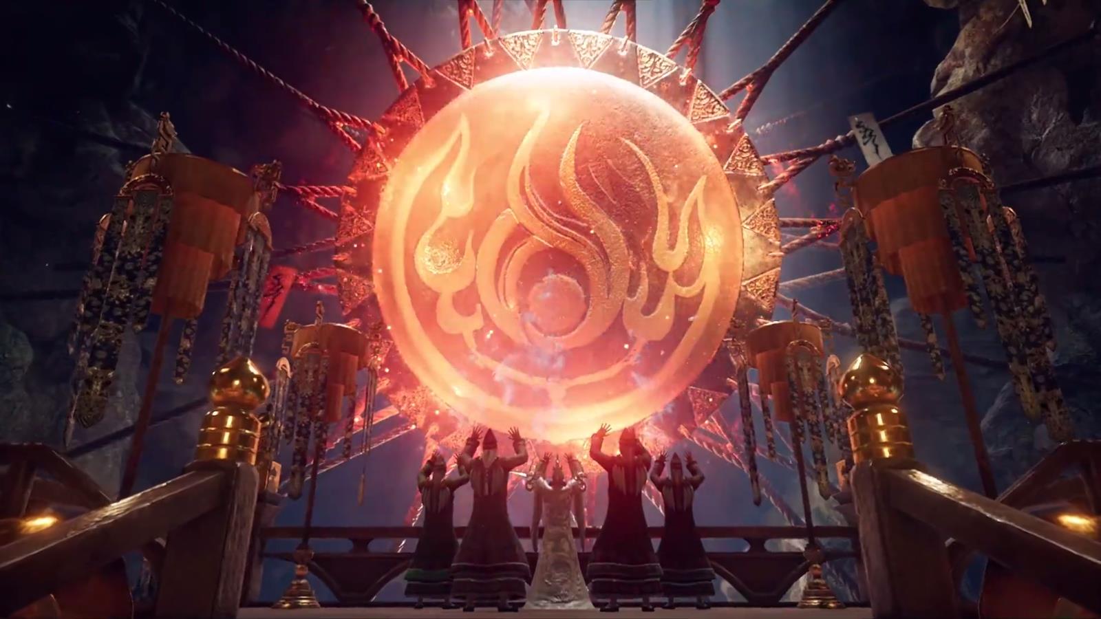 傩是比较原始的祭祀仪式,好歹算是有了上古的感觉,这个片段大概也是宣动中能骗人入坑的一段。除了点题神舞、展现飞星的弓术之外,飞星和他机油们的傩舞配合着村巫念白的《傩曲》,加上辟邪面具、火光等元素,旨在祛瘟鬼敬神灵。剧情上大家都懂的,飞星舞了碰巧净灾了,给了村民无脑迁怒小靶子的机会也给了飞星游历的机会。