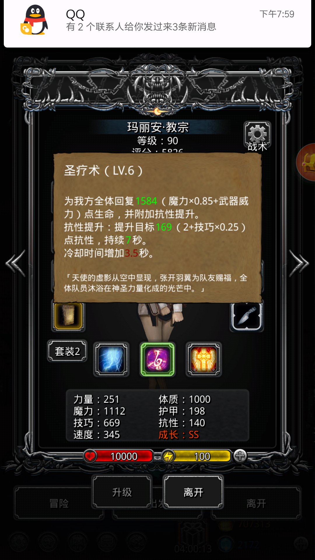 今天只见了两次boss面。三次挂在双杀戮前。今天的副祭司技巧过高,龙枪经常重伤不了,造成最终伤害不够,还差几万....重新弄了一个技巧低的...
