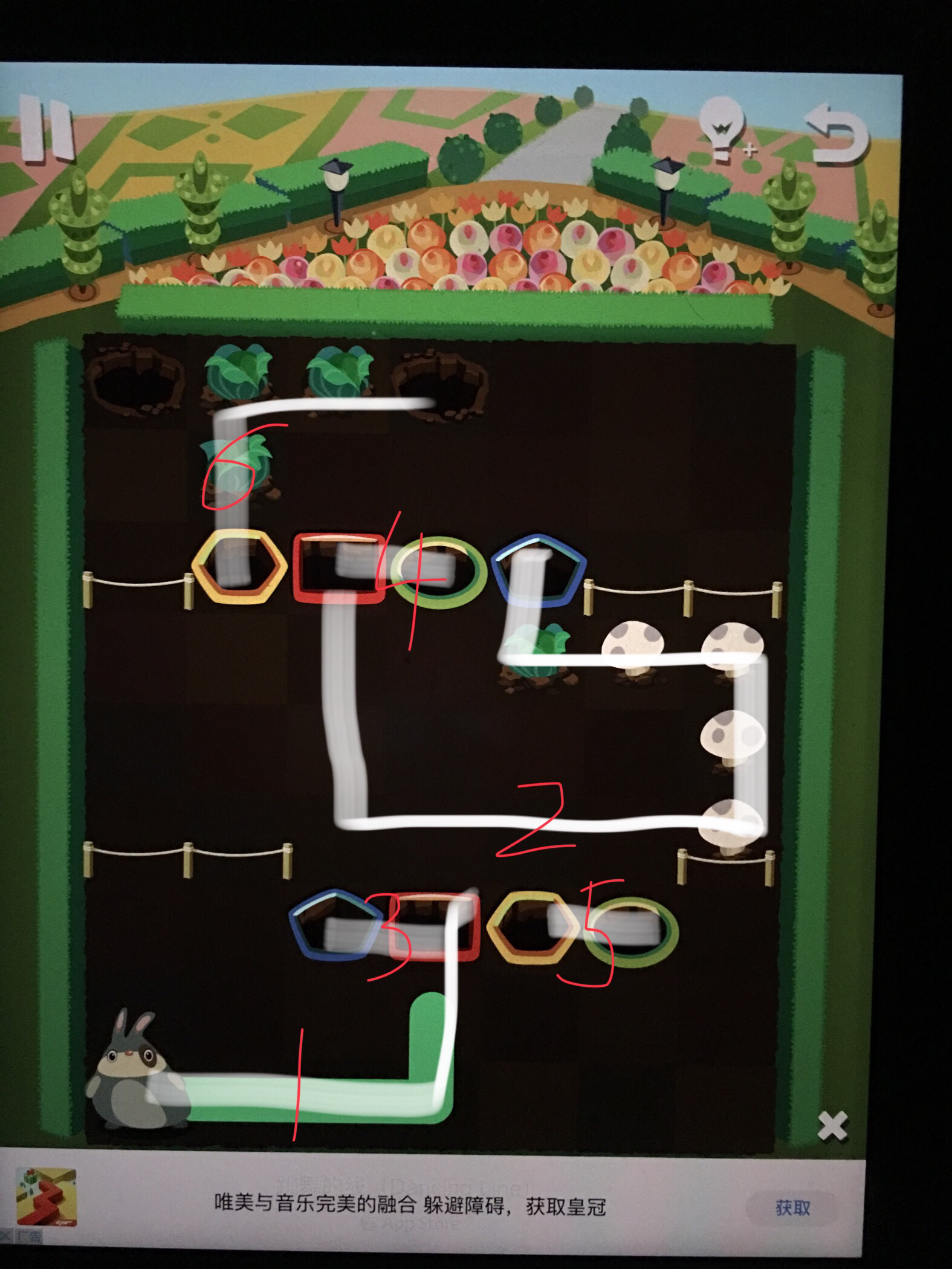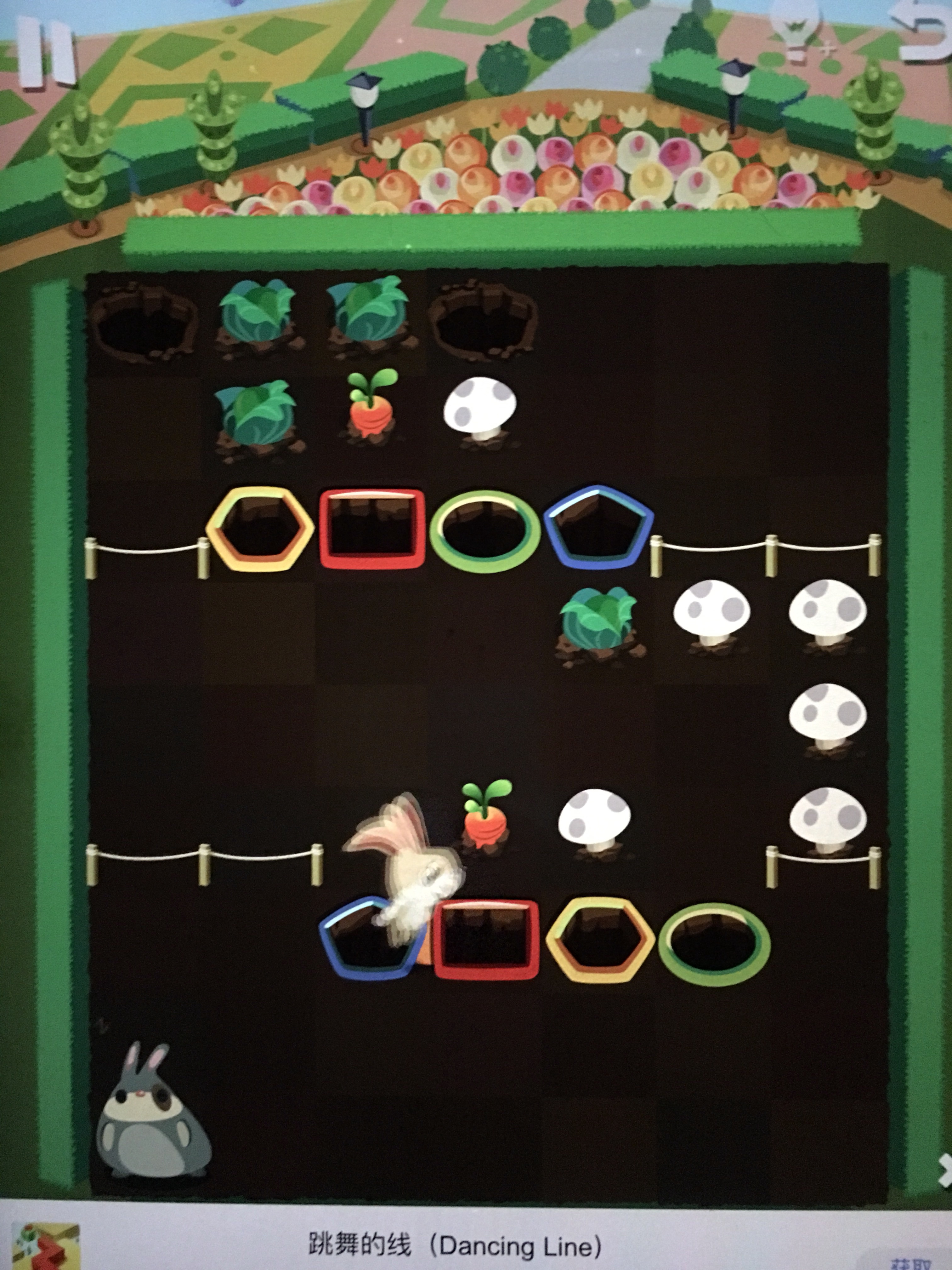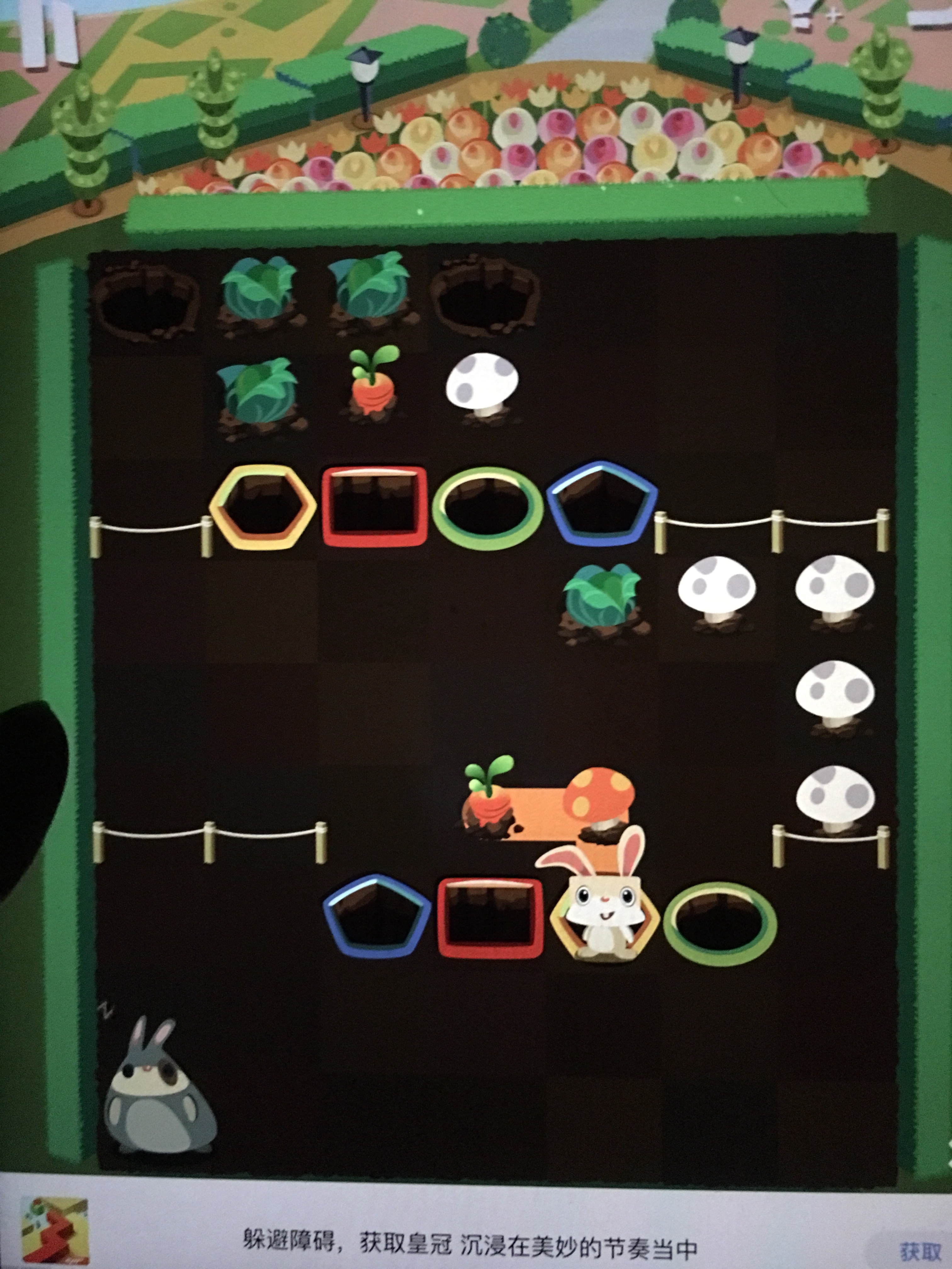 粉兔:进红洞,红—黄,黄—绿,绿—绿,绿—红,红—蓝,蓝—进洞。