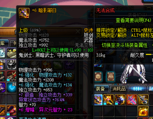 说下本人右边装备情况。武器有90短太光钝,以及荒古棒子,只有短剑稍微打造,如图所示