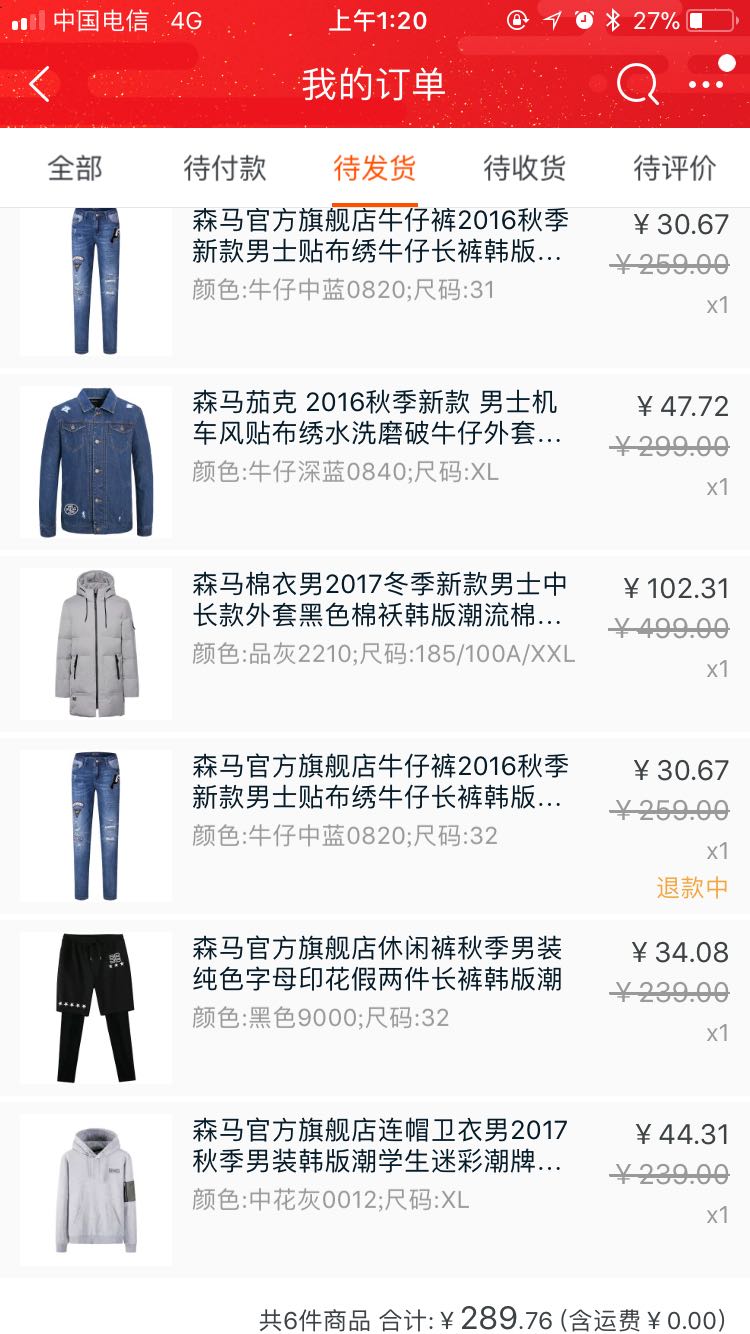 森马要把那条牛仔裤和假两件退了,阿胶糕随便凑的90多,其实一个不要那个喝的