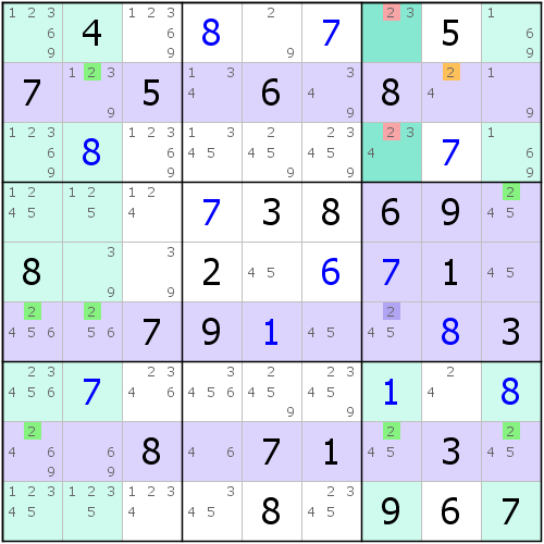 如盘面所示,定义域为行ADFHI和列2。而删除域因为区域过多,所以没有在图上标出。删除域为:行B、列456789和宫789。数一数删除域区域数,就发现一共有10个之多!当假设B4=2时,运用饱和性测试,可以连续得到定义域上A9=2和G2=2。随之结构剩下这么一些:
