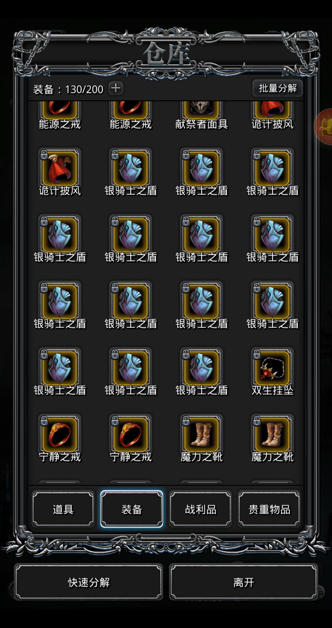 [黑线]那些前期的五大本装用不着了,分解了吧,留一个收藏就好,占空间,分解铁资源及时利用比较好
