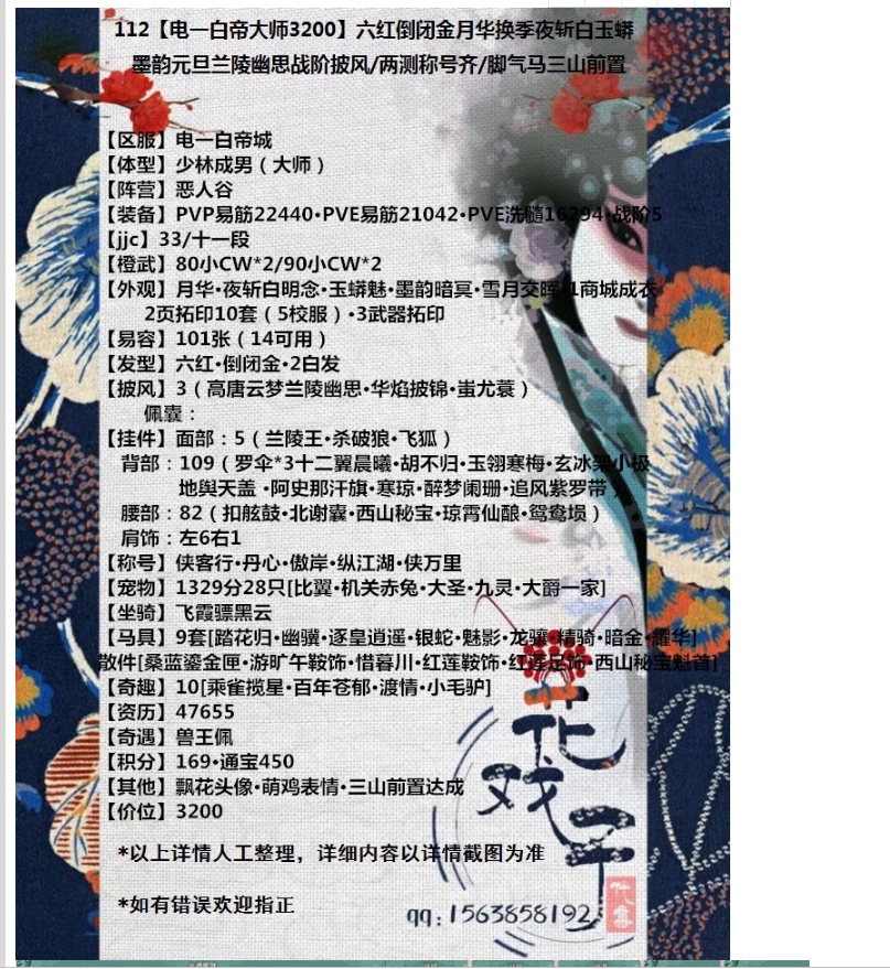 247号【2w6秀姐】电一长安秀姐双95大橙武五猴叽八红苏蝶鸡高考金3白3黑/粉白菜粉人面紫兰庭黄年轮红盒青盒唐盒新七夕盒7成衣/情人枕二代粉六翼等7披风/4w4资历红黑白路茶馆奇缘/脚气马双椅子紫烟沉90小铁满多橙武/四修济世菩萨飘花头像秀姐