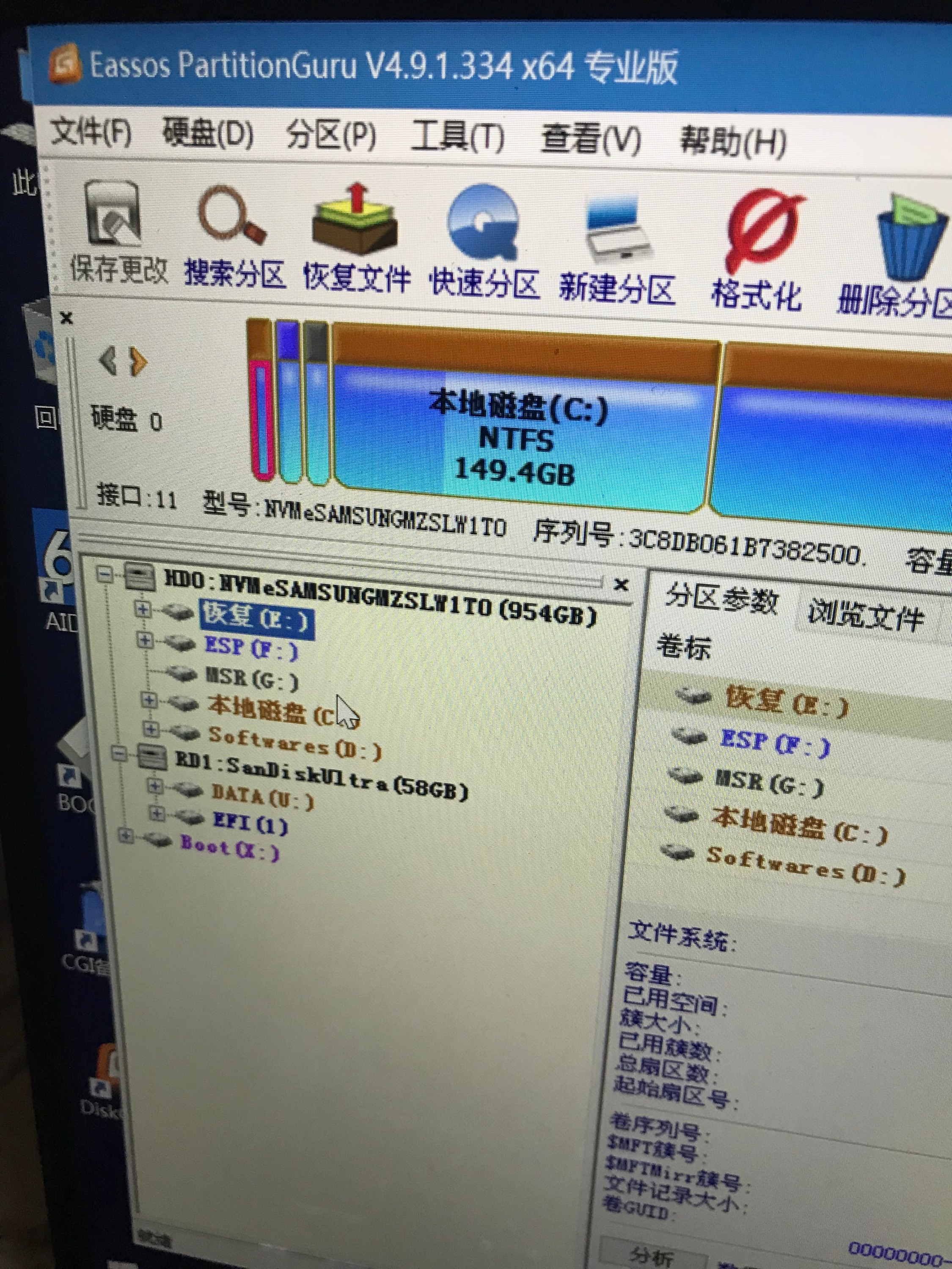 进入PE以后,使用DiskGenies将分区表从GPT格式更改为MBR格式,然后将恢复、ESP、MSR分区删除。再把C盘格式化。