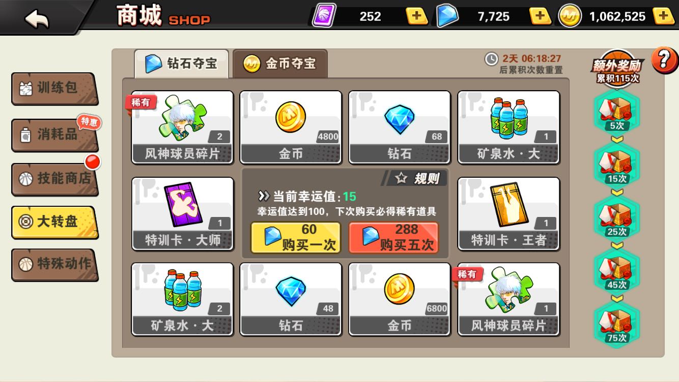 抽风神没1w5别碰,第一圈3个,每次都是中1的,抽了1w8,最后一抽出的2碎片每次的101次都是一片。