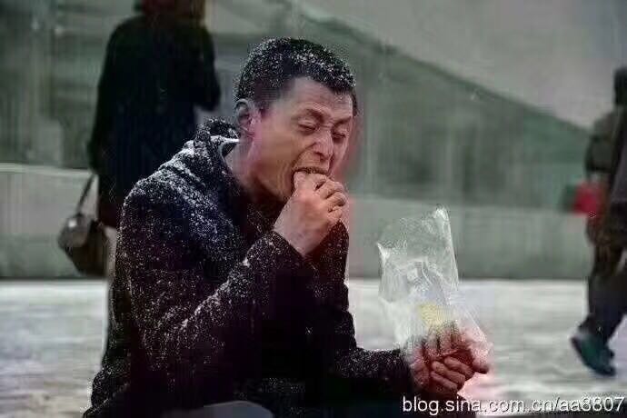 西安火车站拍到这位农民工顶风冒雪等生意的照片,他脸色蜡黄直流鼻涕,不断咳嗽打哆嗦,手上拿着面包大口吃着,吃着吃着他突然低下头哭泣起来。