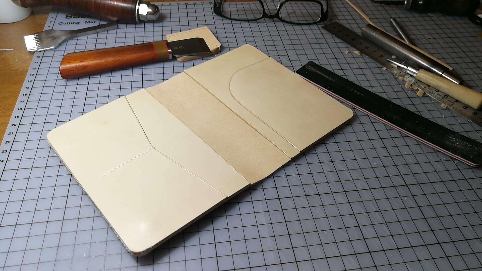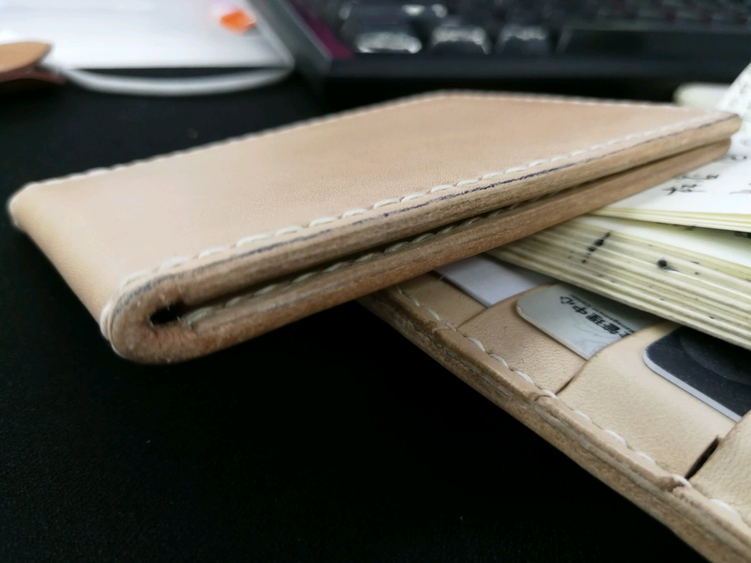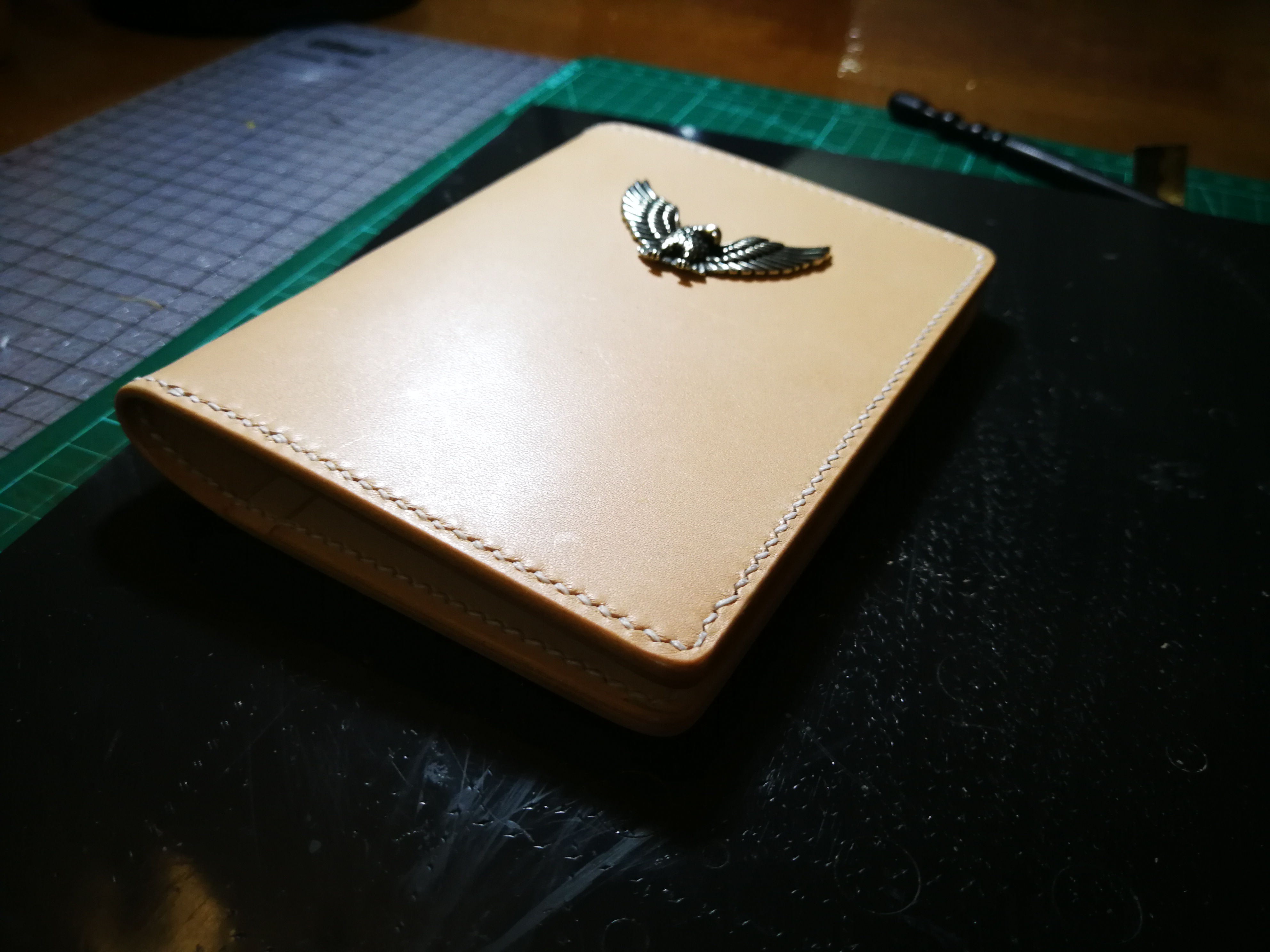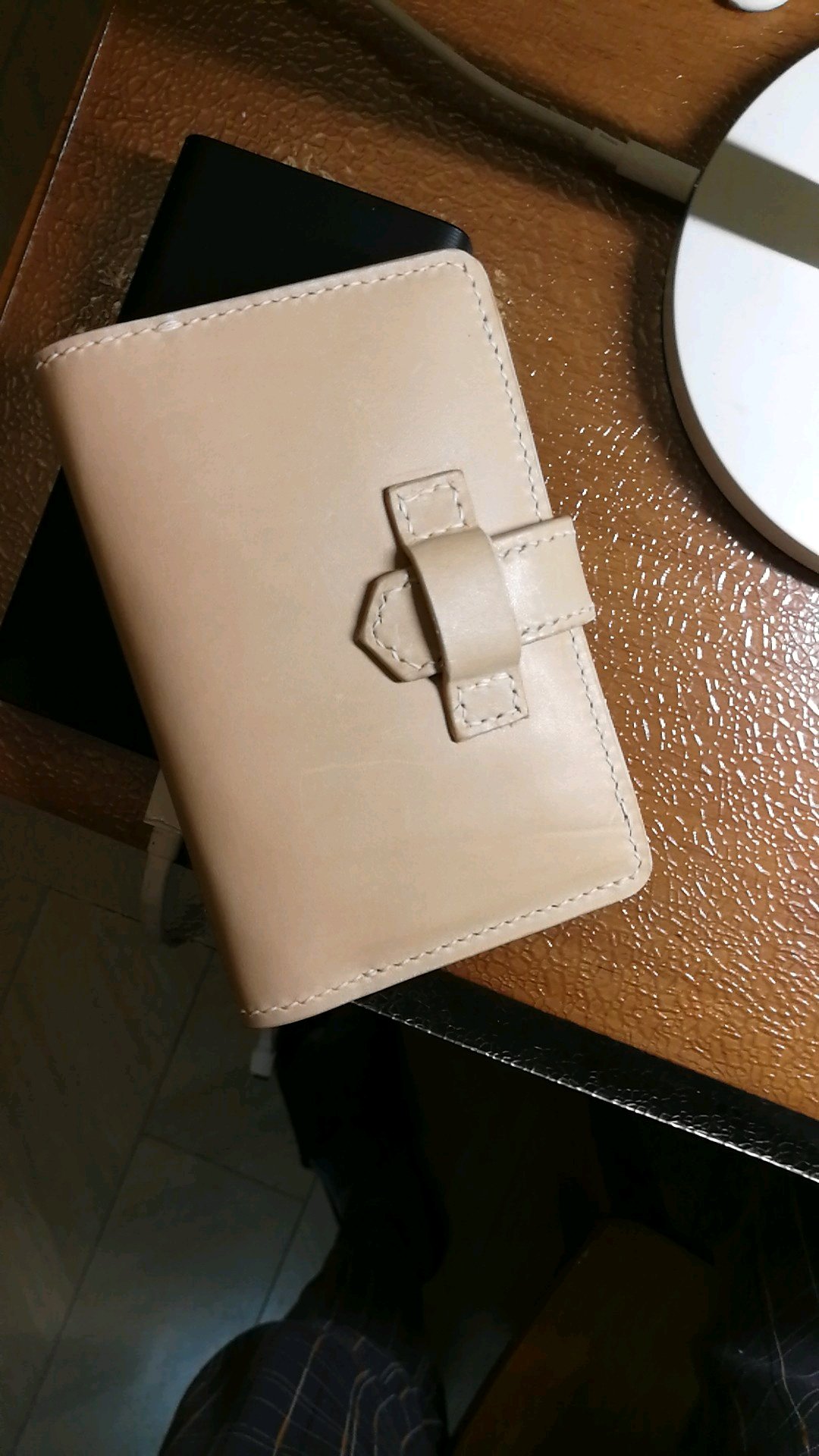 做小本子没有任何经验,只是看了几个视频,量了尺寸,自己画起来开干。现在来看,卡位太多,也没用削薄,导致小本子有点鼓鼓囊囊的。有点失败。搭扣做的有点短,锁不太住本子,失败。渣渣的缝线更是失败。好在自己用,就这么着吧。