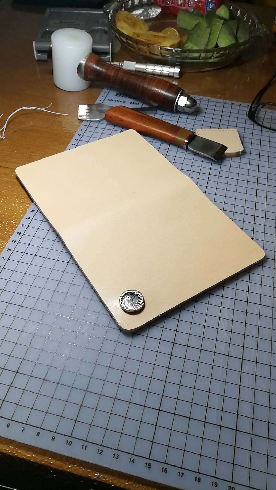 因为平常下班晚,打斩怕影响邻居。只好利用平常时间裁皮下料组装,周日统一打斩,有空就缝缝线。下周慢慢缝吧