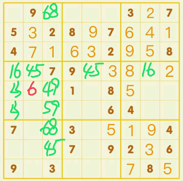 比较复杂。4宫23数对,4行45/16数对,3列68数对,综合得到4宫459数组,e2唯余出6