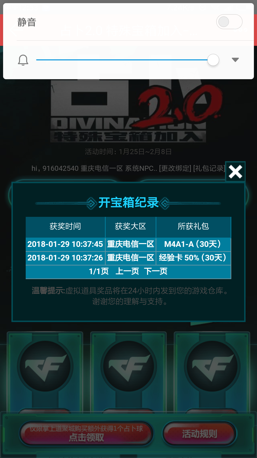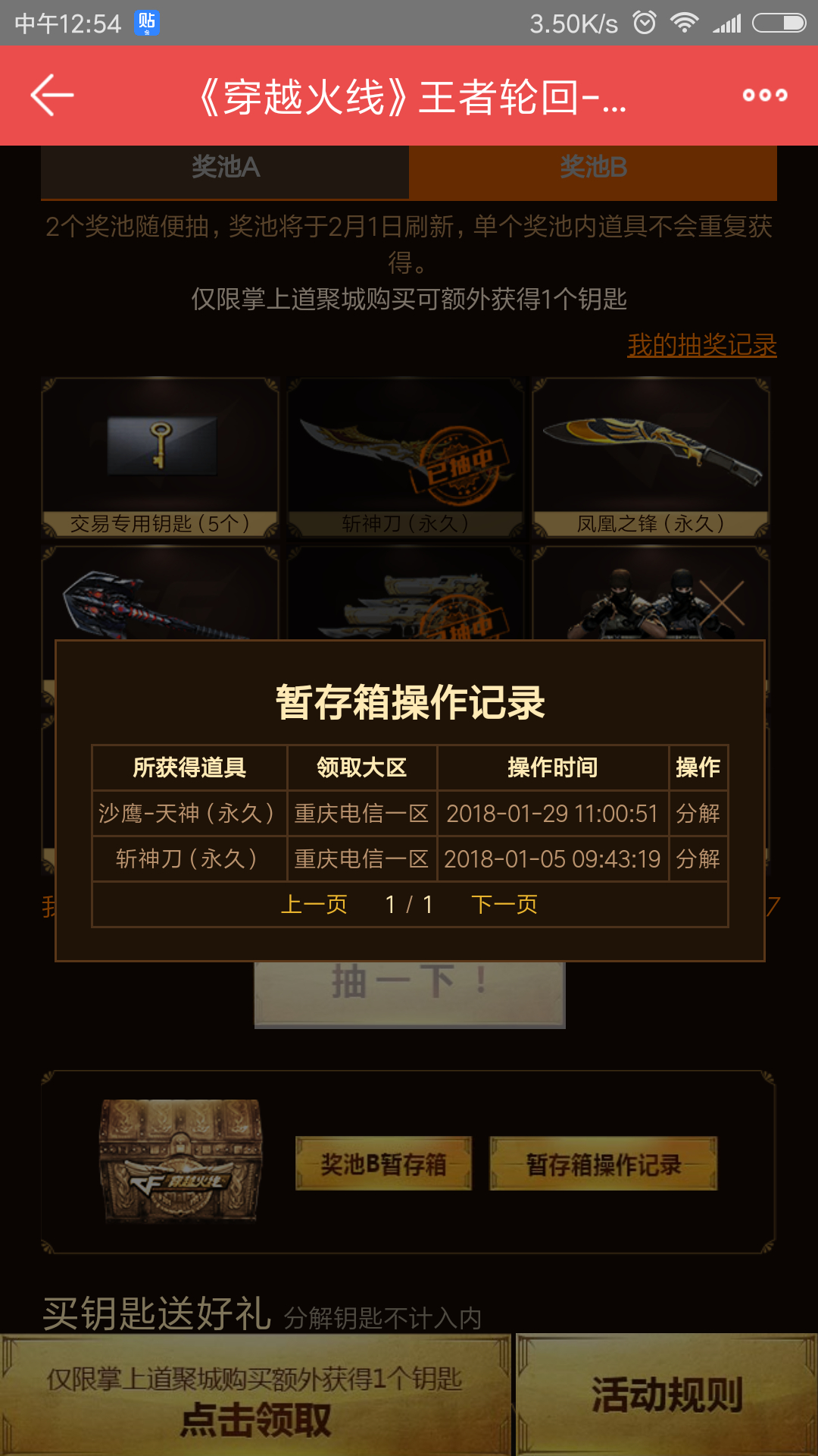 哈哈,这两个破活动不要充钱,只有亏,我除了王者轮回其余活动从来没中过奖,就现在这个王者轮回我50块中一把龙啸和一把天神,把龙啸发仓库了,把天神分解成钥匙了,把钥匙留到2月1号奖池更新了接着抽。