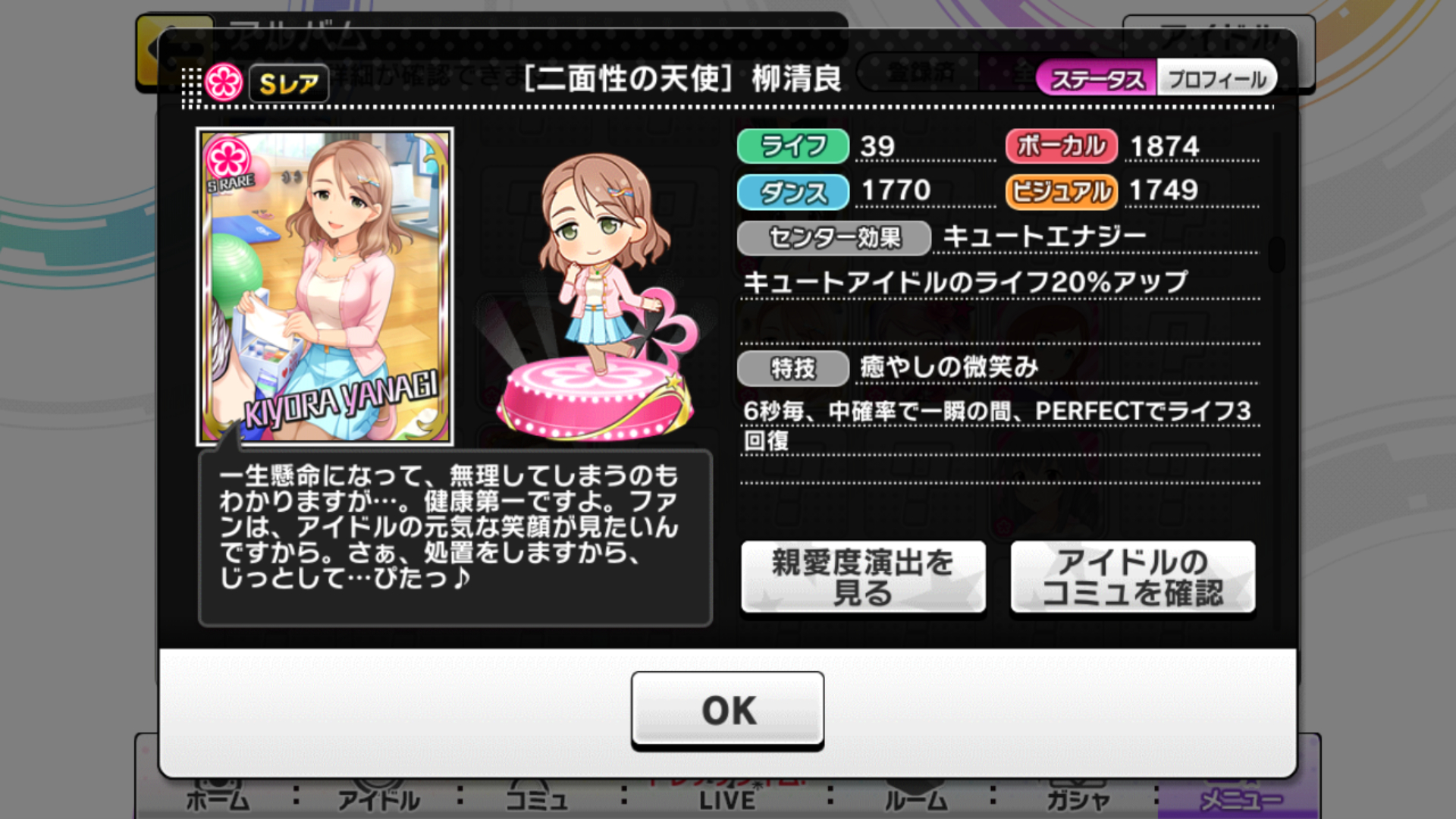 刚开始还觉得她不像偶像,给人贤妻良母的感觉,萌新的我才知道这是张奶卡?心想也对,奶妈么,这种插图也蛮般配的,因为老用,所以好感很快满了。
