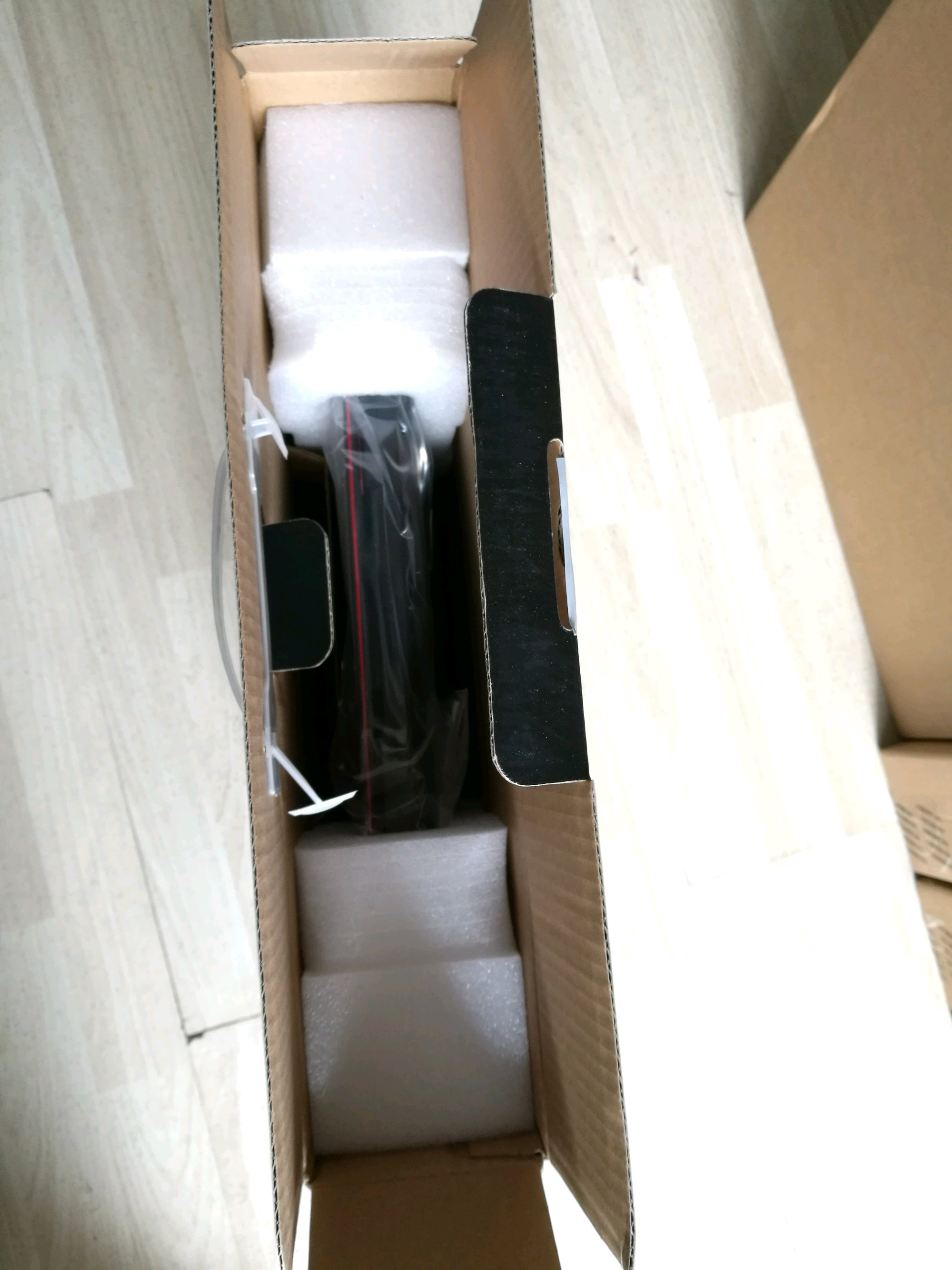 拆开外箱后,内部还有个黑色箱子,这个才是机器包装盒