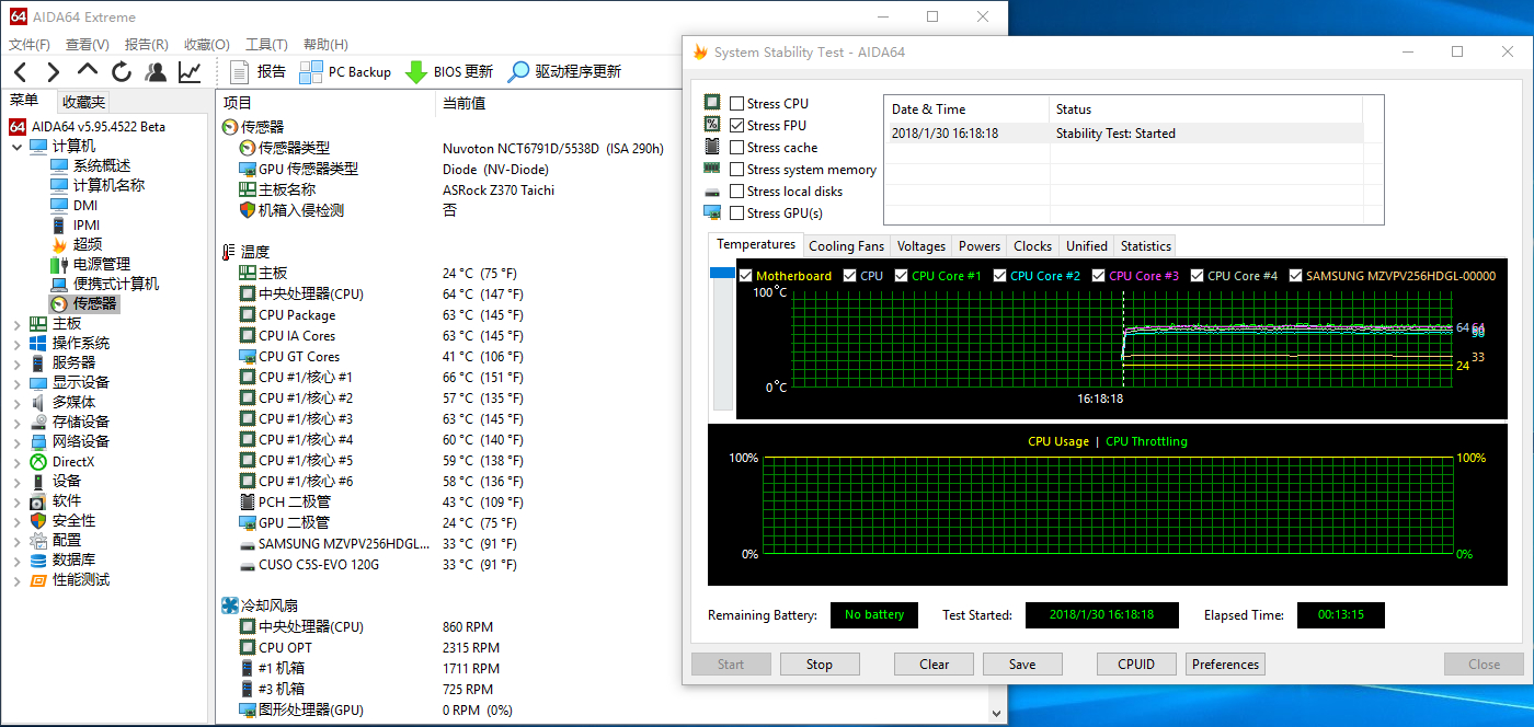 8700K开盖上液金,,4.7G,1.23V,温度单烤FPU,15分钟,稳定65度