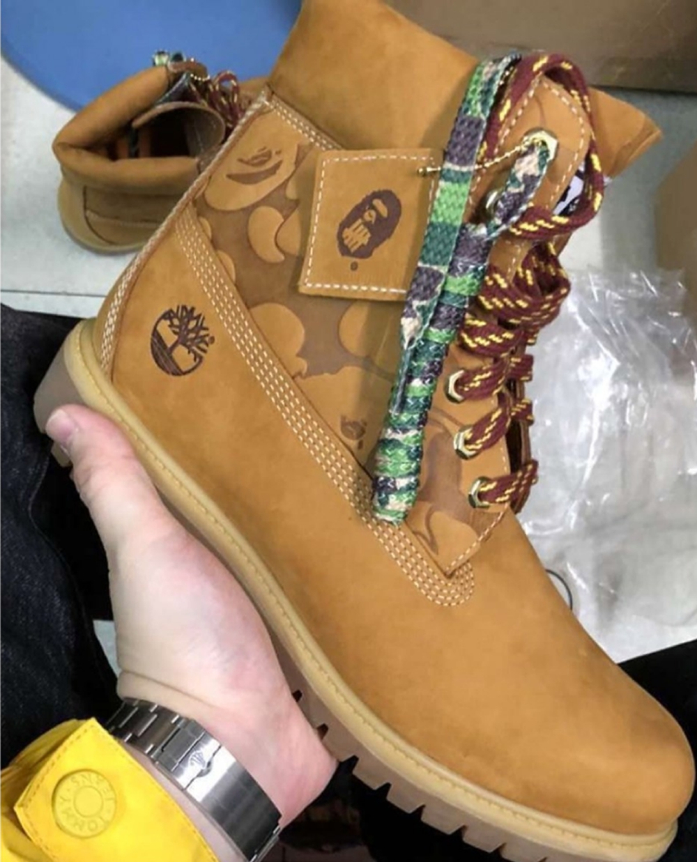 由 Ins 账户 2muchsol3 率先曝光,在保留 Timberland 6-Inch Boots 经典轮廓的同时,在鞋身注入 BAPE 的 CAMO 压印图案,鞋舌醒目的 BAPE、UNDEFEATED、Timberland 三方 Logo 一并示人,霸气十足。