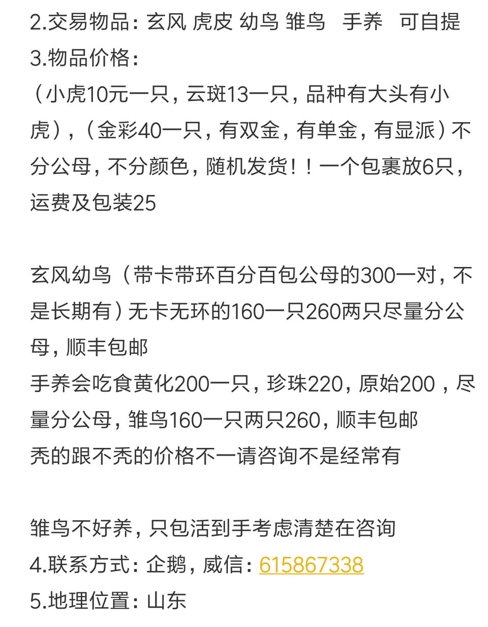 新手想收养玄凤养!可以到达山西的联系