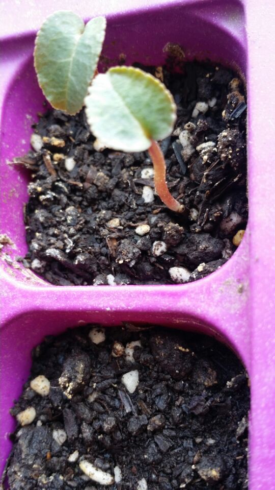 目前为止,16粒出了13粒,有一棵叶子还没有长出就慢慢打蔫了,后来就没后来了,还有一棵只看到小根球,还没长叶子出来,出苗还相当不错的呢!
