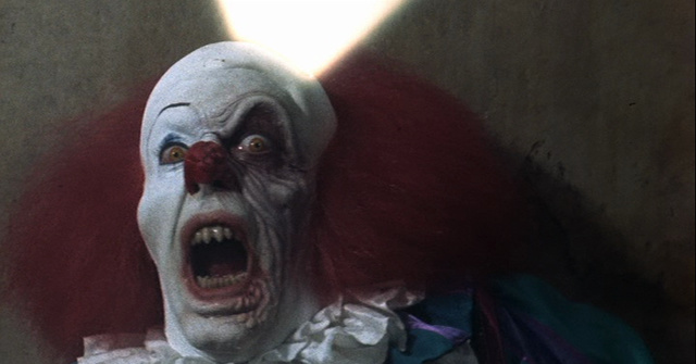 《小丑回魂》(1990)里的小丑,惨白的脸,夸张的表情。