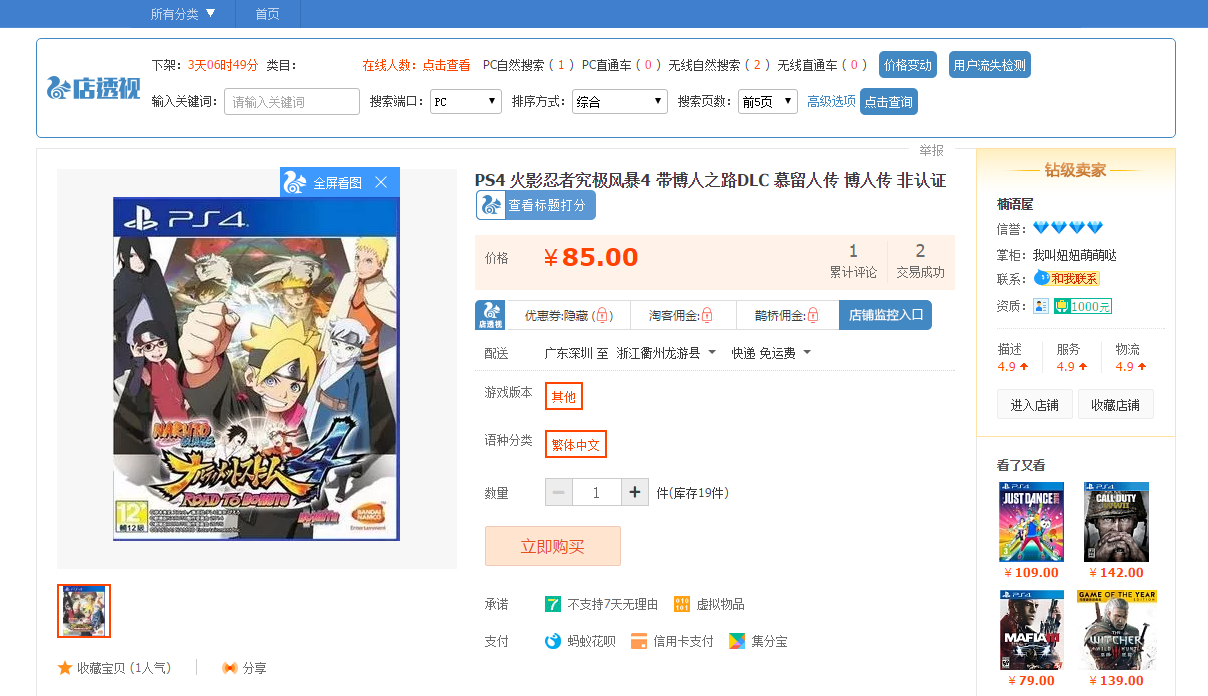 联系了半天反正是不给我了,现在也是无语了,四颗钻的店铺就这点信誉?不是说我图便宜,这个火影忍者传承游戏也只是拿来尝尝鲜没觉得需要买光盘,这100多就当是喂狗了,唉