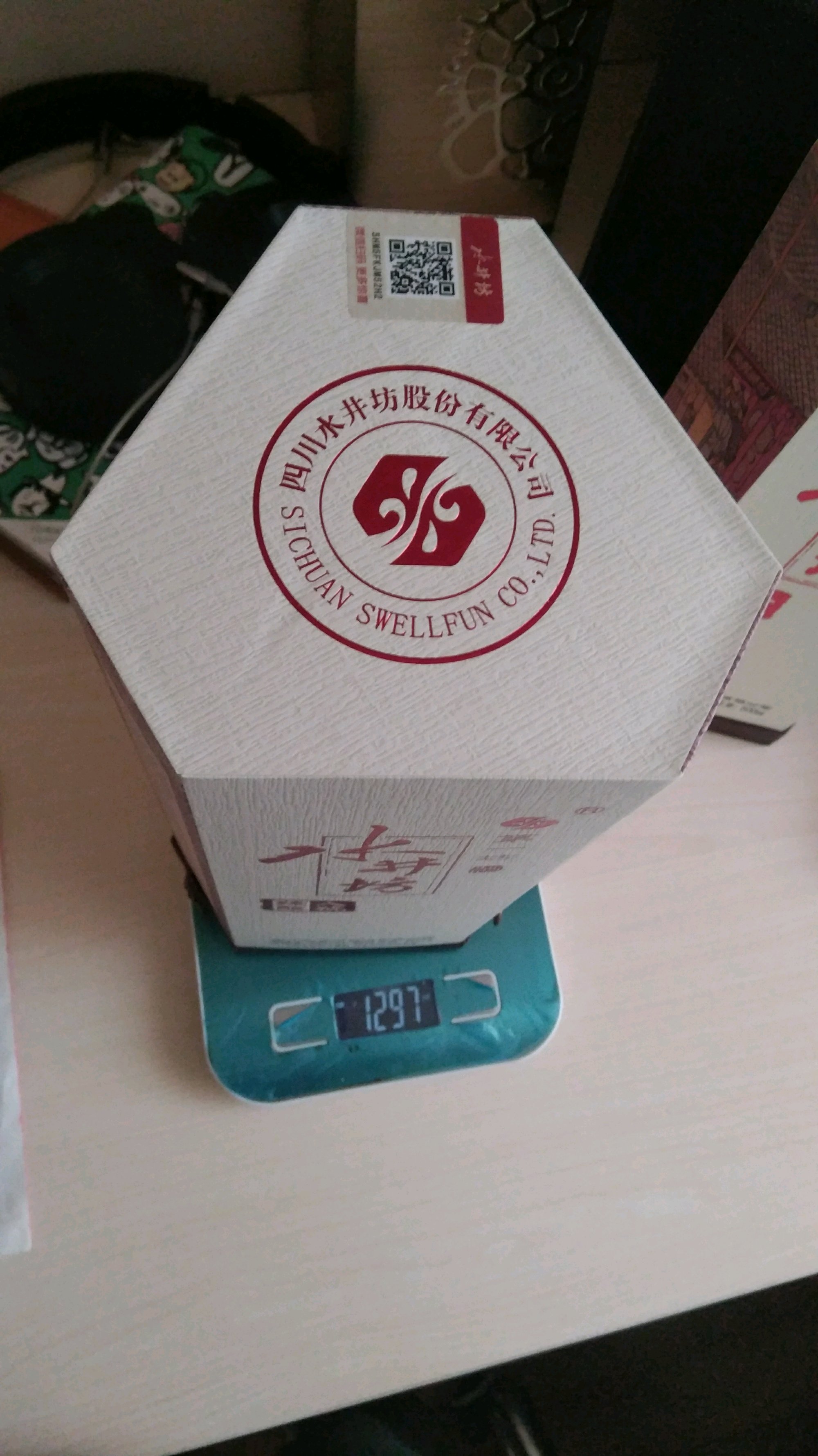 同时我又称了一下带着盒子的重量,更惊奇的事情发生了,瓶子重的一瓶酒带着盒子反而轻。图三图四所示。这个图拍的不好,无法证明重的酒瓶在轻的盒子里,但我保证确实没有搞错。