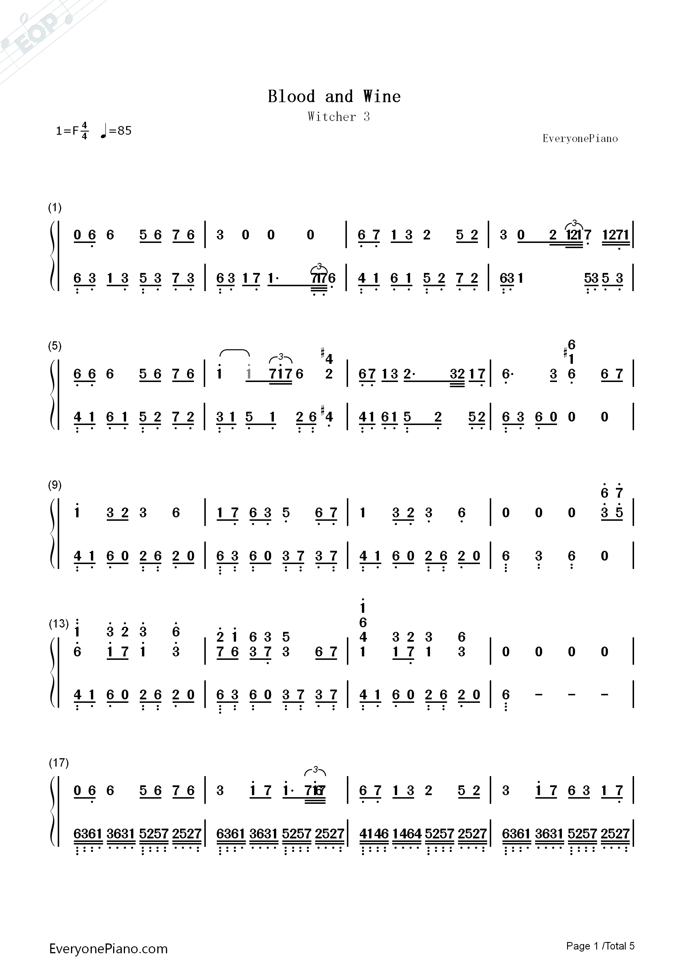 《Blood and Wine》-《巫师3》背景音乐 - Marcin Przybyłowicz 五线谱+双手简谱已更新,更多钢琴谱直接去(左上角)下载吧