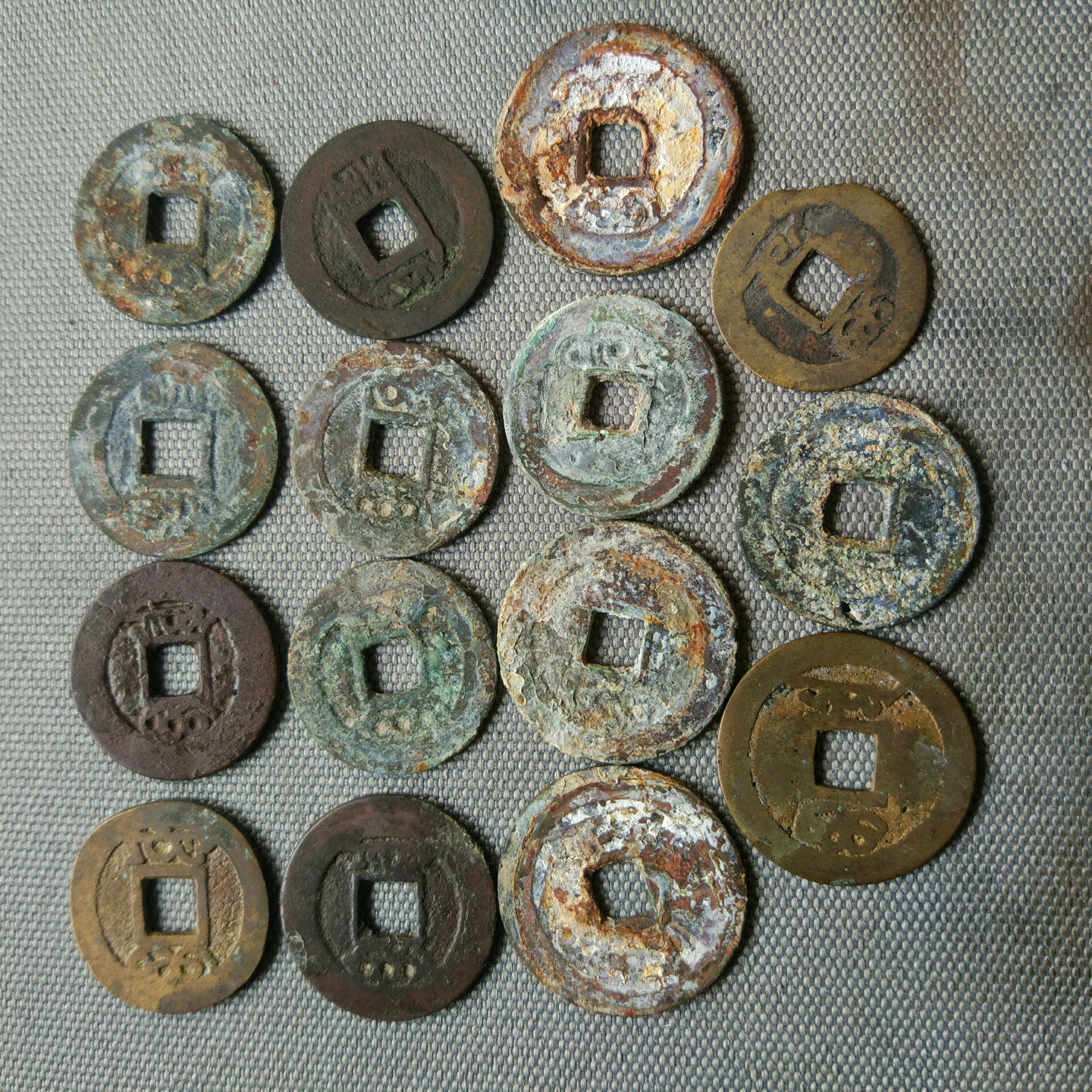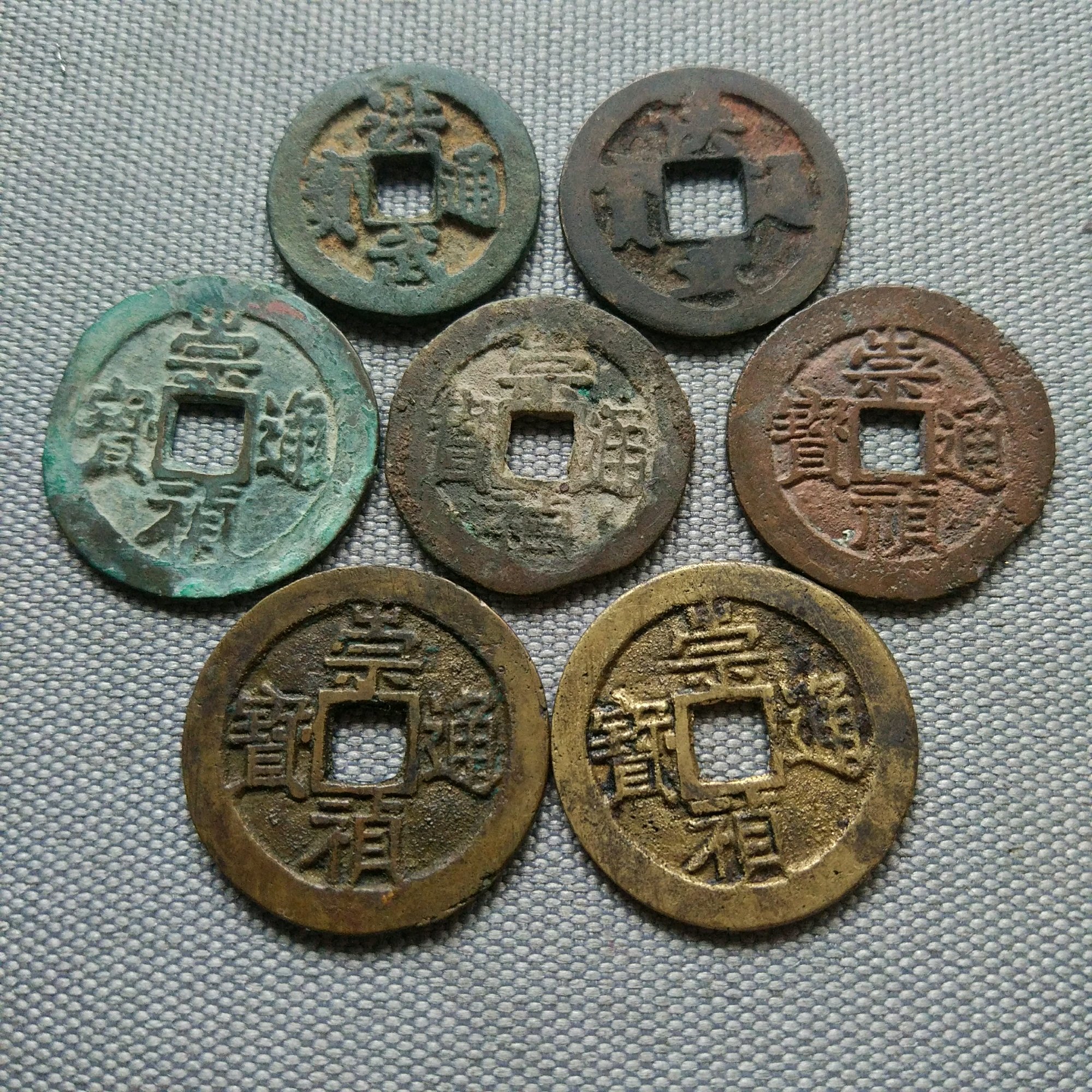 明钱一组,从家里卡卡缝缝搜刮出来的,洪武背一钱,洪武小平,崇祯小平大样两枚,崇祯背字三枚不圆,通走价200元