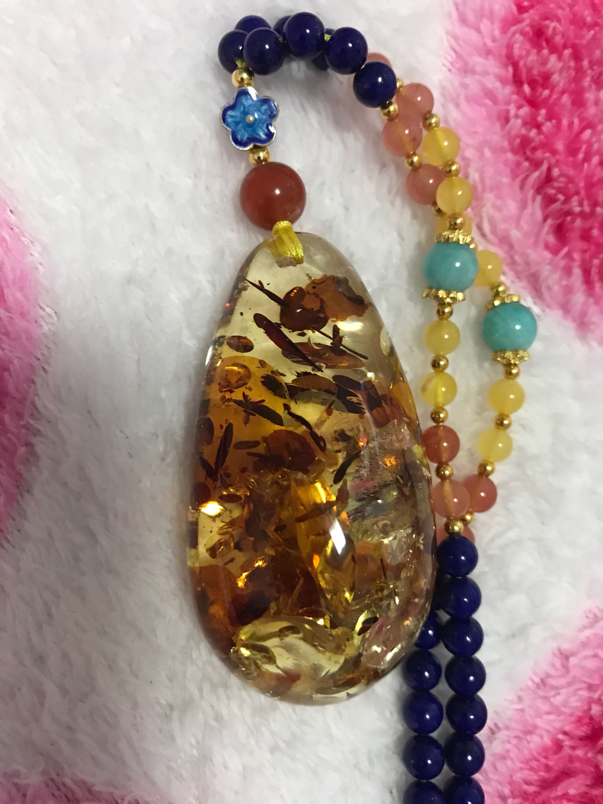 请问这个是天然花珀吗?26克,加上青金石链子2450,值吗