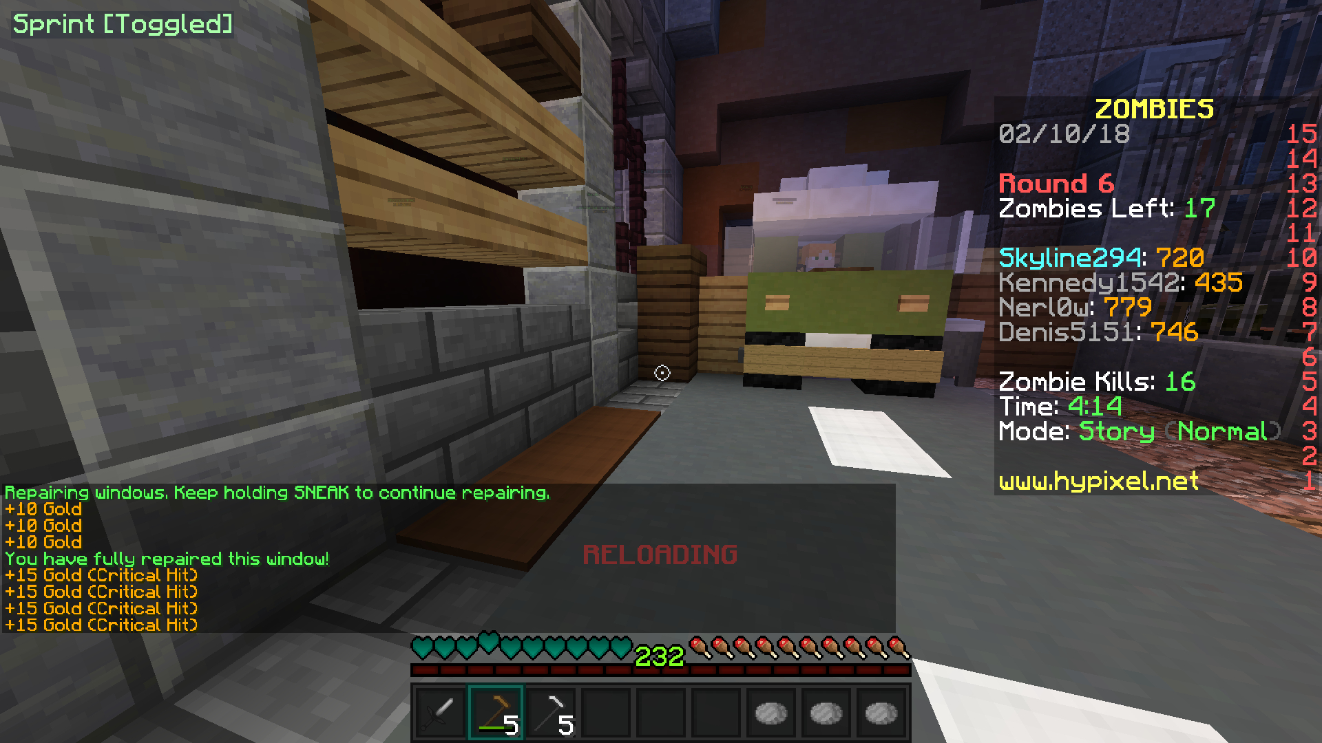 栏杆被僵尸破坏后可以进行修理,如上图所示,只要站在窗户旁边按住shift,栏杆就会自动修理,修一个半砖会使你获得10金币,如上图左下角所示,我因为修了4个半砖而获得40金币