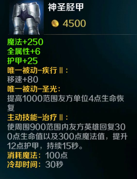 这里说明,一个好的贞德,有四个装备是必选的。一是神圣胫甲。贞德必备。回血回魔,增加友军生命回复速度,增加护甲,全部都是有用的。