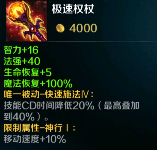 第四件,就是极速权杖。4000元,提供10%移速,20%冷却,共计56法强,生命和魔法回复,性价比也很高。