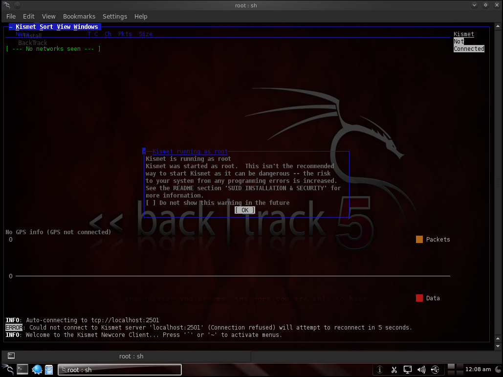 01、点击选项找到Back Track、再点击information Gathering、继续点击、Wireless Analsis、再次点击WLAN Analysis、最后点击选项kismet