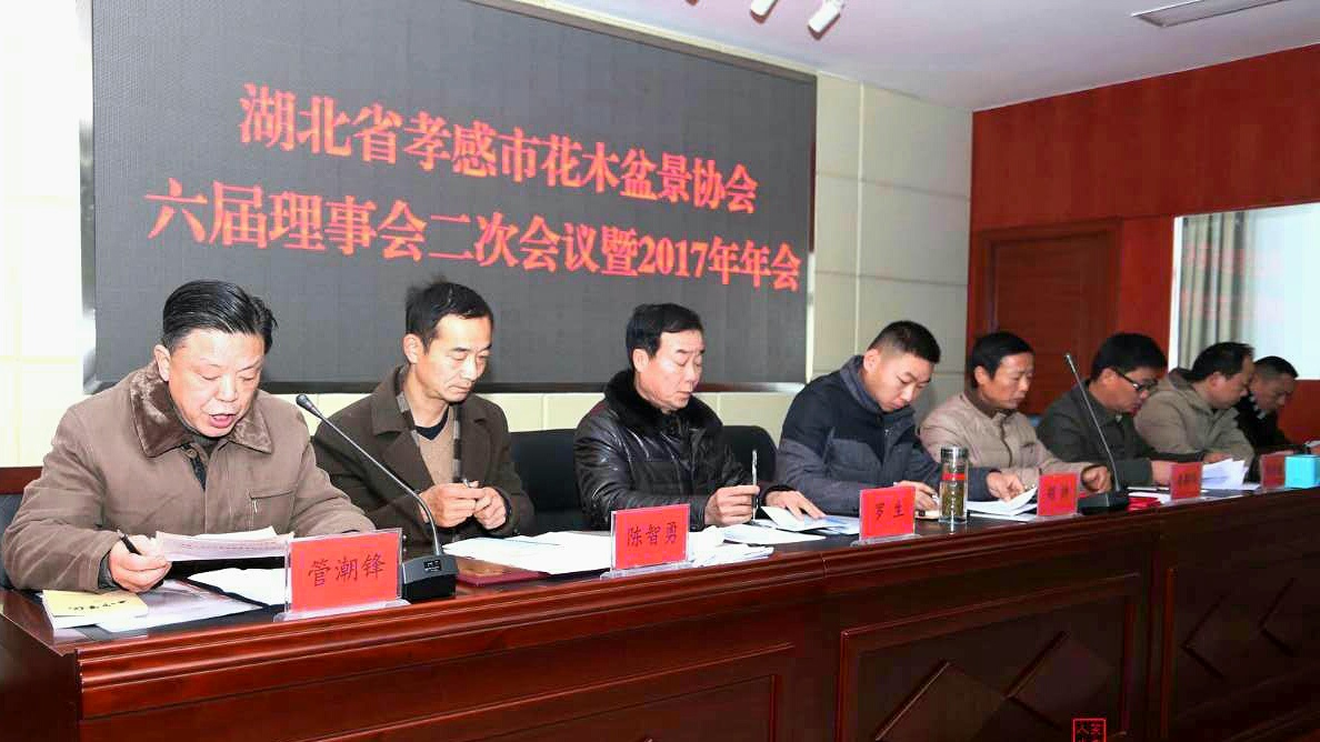 湖北省孝感市花木盆景协会六届理事会二次会议暨2017年年会于2018年2月4日上午在孝感市林业局召开。出席会议的有市林业局领导,孝感盆景界老前辈,孝南、汉川、应城、云梦、安陆、大悟、孝昌、双峰山旅游风景区等地花木盆景协会负责人、协会理事等46人。