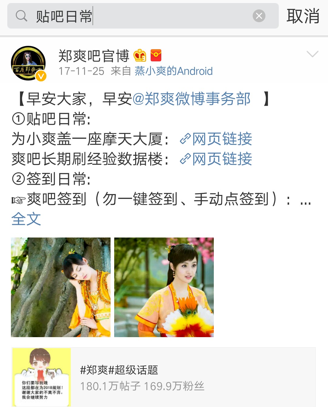 请关注@郑爽吧官博 (点击右上角官博内搜索贴吧日常或签到日常。