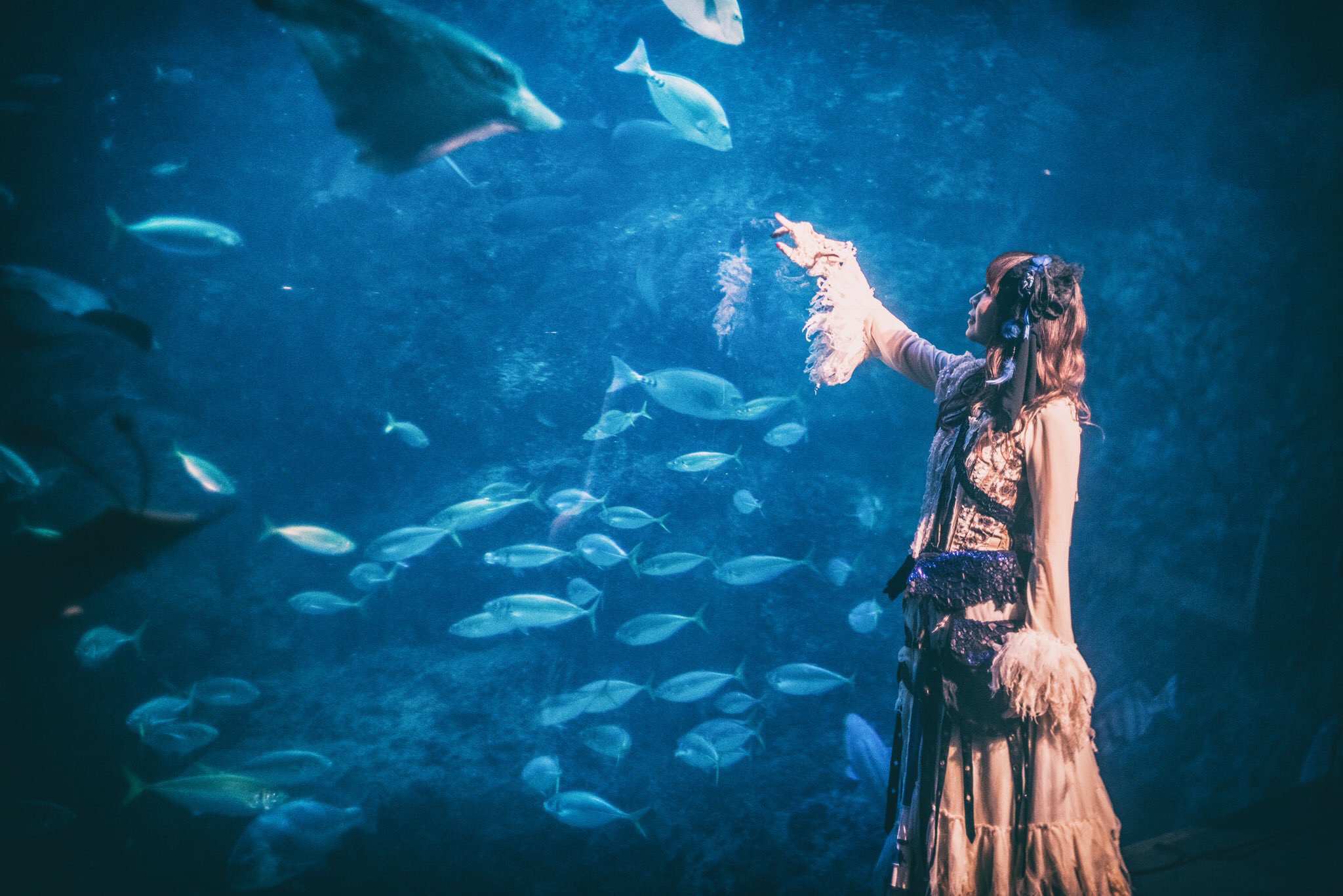 「今回は、シンプルに音楽と動く魚たちを観てもらいたくて、海底でライブをしたいなという思いつきから新江ノ島水族館へ辿り着き、こういうライブをしました」。他にもMCを通し、ヴィクトリアンスチームパンクローレライというテーマで制作したh.NAOTOの衣装を身にまといステージングをしていたこともyucatは伝えてきた