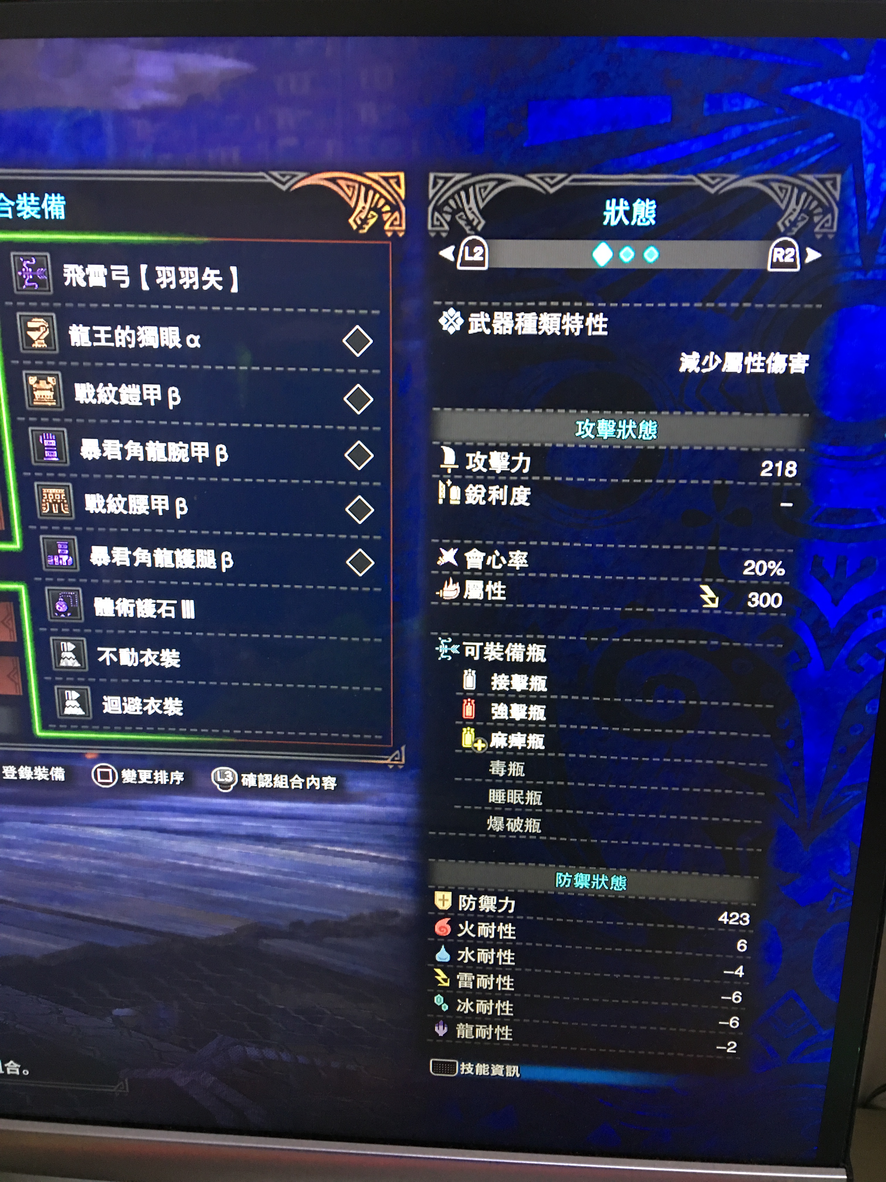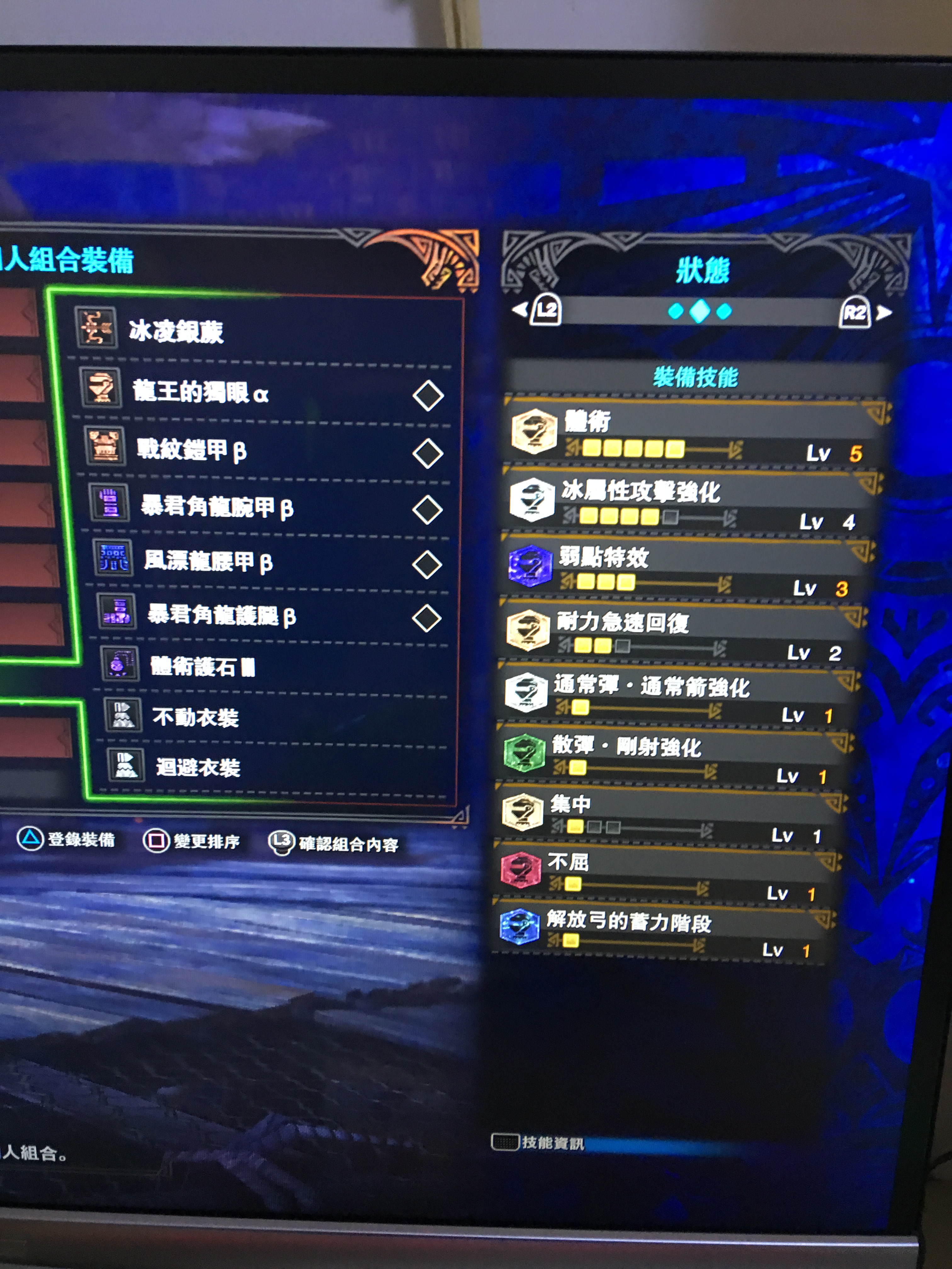 顺带一提 还有隐藏技能 角龙两家套的炖鸡哦~~~核心是体术5 耐力回复2 弱特 通常弹强化 散弹强化 和强弓,然后因为属性弓的属性提升是有上限的不能无脑打属性珠子,所以在攻4 和属性面前我认为攻击UP4的提升会优先一点