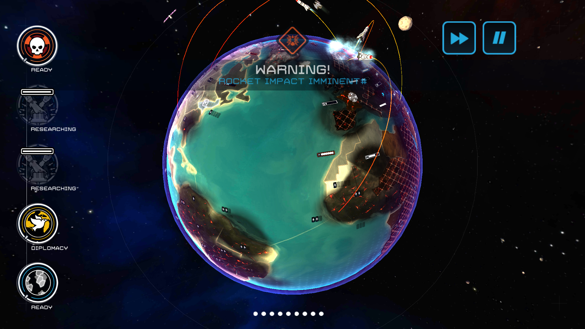 在和最后一个大国互撕的时候不用太多顾及防御,尽管造irbm轰炸,适当防守就可以了,碰到导弹特多的饱和打击干脆一颗也别拦,等炸掉了再扩回来,经过不停的irbm打击中国已经没多少地了