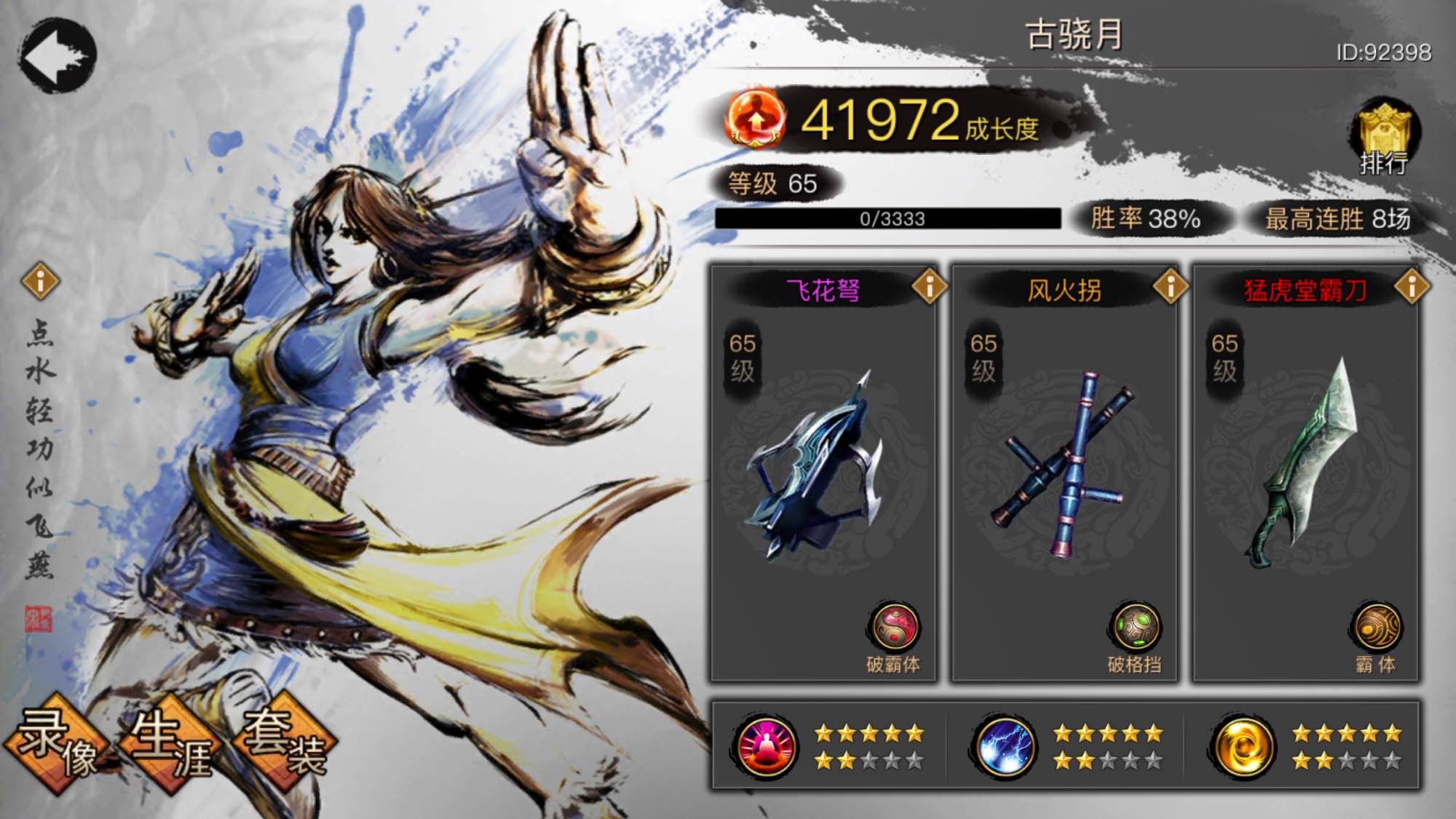 两把弩,封喉剑放中间,靠近就用剑,离开就用弩,把补血的两个大招放前面