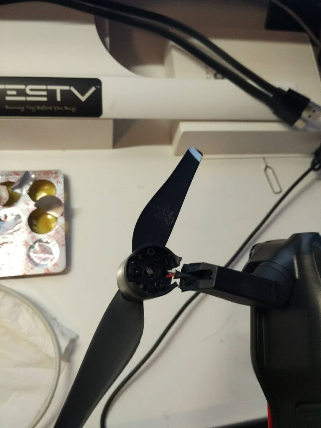 赶紧下楼捡回来发现有一只螺旋桨断了(如图)