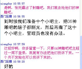 到时候我们准备十个小吧主,把06神雕吧的贴子都删光,然后再撤了这十个小吧主,管理员也没有办法。