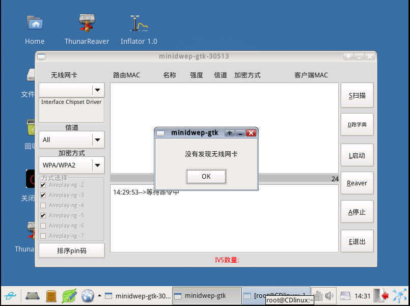 01、打开minidwep-gtk、提示没有发现无线网卡、存在许多电脑不支持、必须在官方京东商城或淘宝商城购买芯片8188网卡实现破解无线WiFi网络
